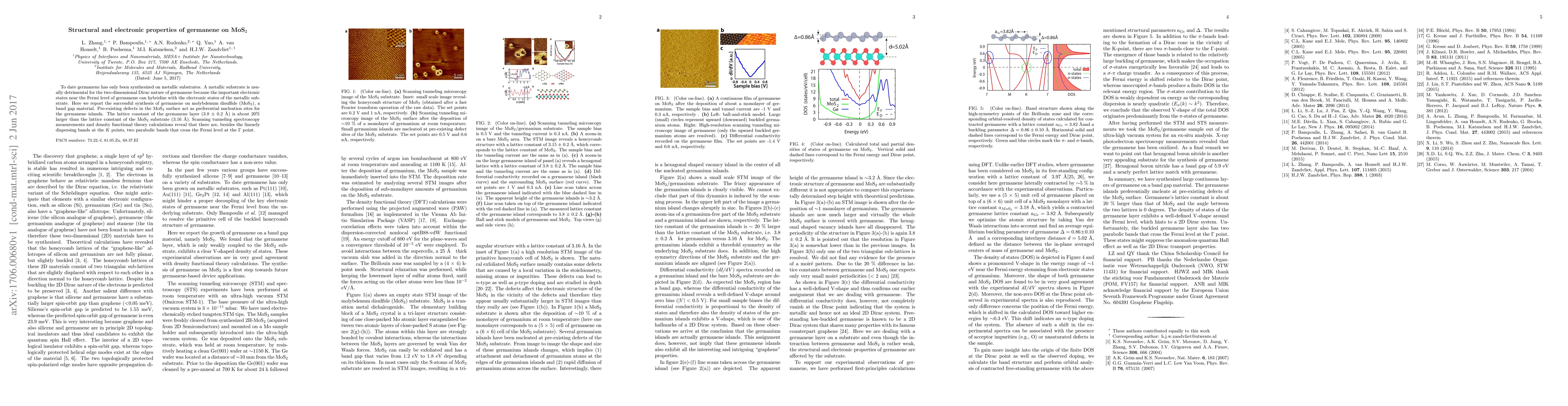 This paper reports the successful synthesis of germanene on MoS$_2$, a band gap material, preserving the two-dimensional Dirac nature of germanene. Scanning tunneling spectroscopy and DFT calculations show that germanene on MoS$_2$ exhibits linearly dispersing bands and additional parabolic bands crossing the Fermi level.