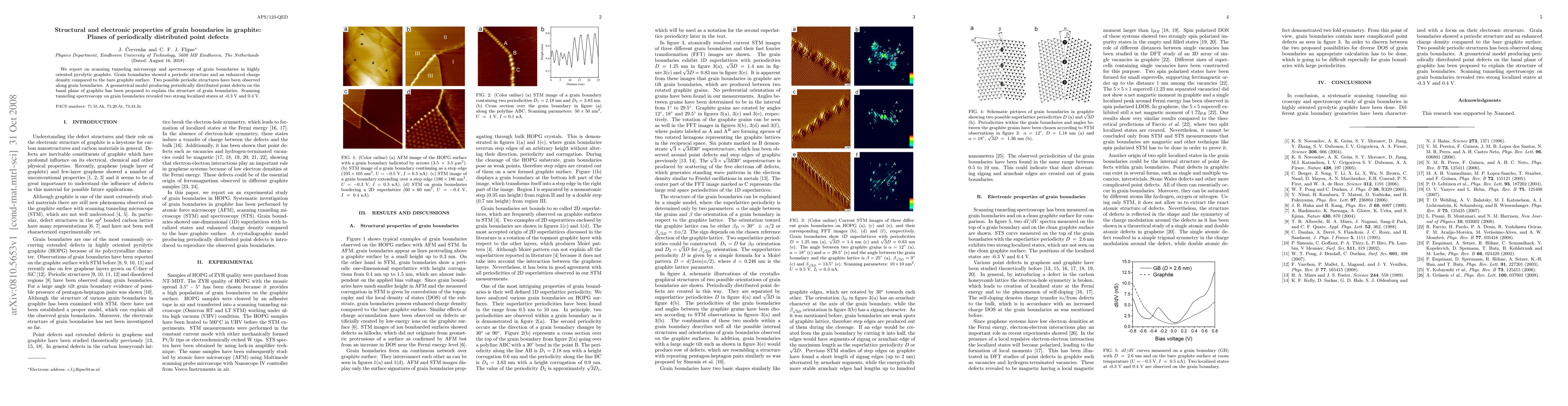 This study uses scanning tunneling microscopy and spectroscopy to investigate grain boundaries in highly oriented pyrolytic graphite, revealing a periodic structure and enhanced charge density. A proposed geometrical model explains the observed point defects, and spectroscopy identifies two localized electronic states at -0.3 V and 0.4 V.