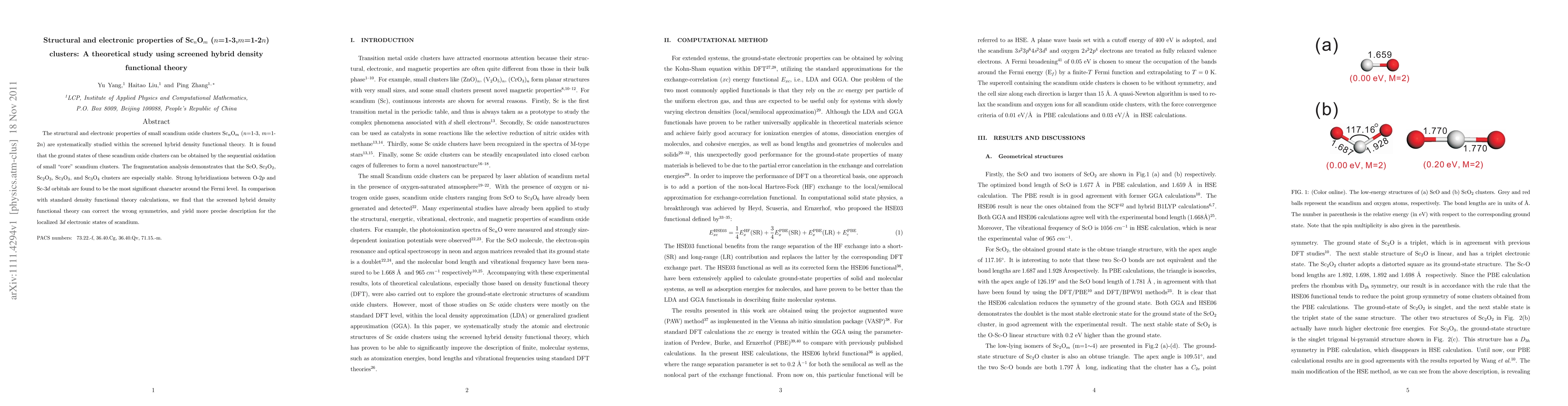 This study investigates the structural and electronic properties of scandium oxide clusters using screened hybrid density functional theory. The research reveals that ScO, Sc2O2, Sc2O3, Sc3O3, and Sc3O4 clusters exhibit significant stability, with strong hybridizations between oxygen and scandium orbitals near the Fermi level, and highlights the improved accuracy of screened hybrid density functional theory over standard DFT for describing scandium's localized electronic states.