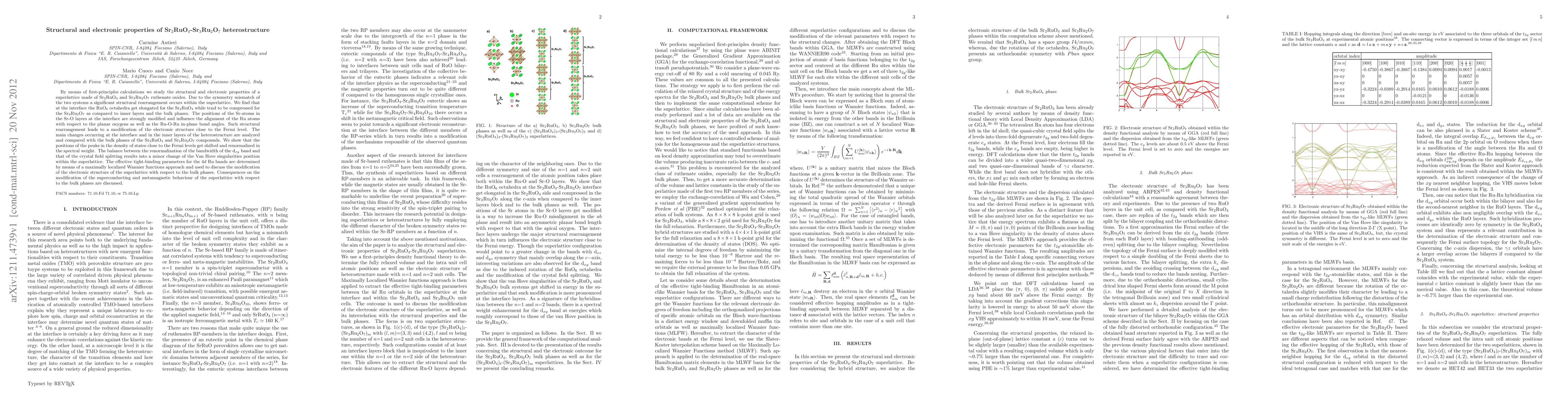 By means of first-principles calculations we study the structural and electronic properties of a superlattice made of Sr2RuO4 and Sr3Ru2O7 ruthenate oxides. Due to the symmetry mismatch of the two systems a significant structural rearrangement occurs within the superlattice. We find that at the interface the RuO6 octahedra get elongated for the Sr2RuO4 while tend to be compressed for the Sr3Ru2O7 as compared to inner layers and the bulk phases. The positions of the Sr-atoms in the Sr-O layers at the interface are strongly modified and influence the alignment of the Ru atoms with respect to the planar oxygens as well as the Ru-O-Ru in-plane bond angles. Such structural rearrangement leads to a modification of the electronic structure close to the Fermi level. The main changes occurring at the interface and in the inner layers of the heterostructure are analyzed and compared with the bulk phases of the Sr2RuO4 and Sr3Ru2O7 compounds. We show that the positions of the peaks in the density of states close to the Fermi levels get shifted and renormalized in the spectral weight. The balance between the renormalization of the bandwidth of the dxy band and that of the crystal field splitting results into a minor change of the Van Hove singularities position within the superlattice. The effective tight-binding parameters for the 4d Ru bands are determined by means of a maximally localized Wannier functions approach and used to discuss the modification of the electronic structure of the superlattice with respect to the bulk phases. Consequences on the modification of the superconducting and metamagnetic behaviour of the superlattice with respect to the bulk phases are discussed.