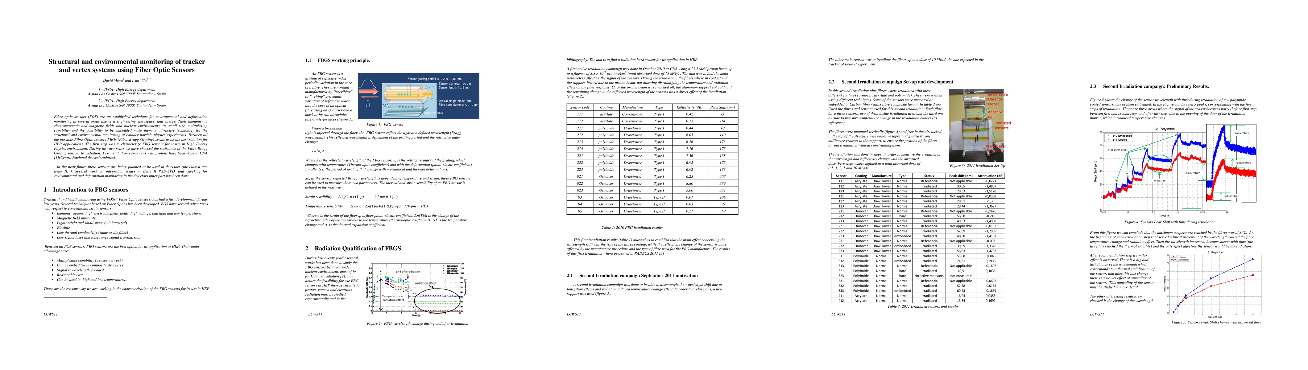 Fibre optic sensors (FOS) are an established technique for environmental and deformation monitoring in several areas like civil engineering, aerospace, and energy. Their immunity to electromagnetic and magnetic fields and nuclear environments, its small size, multiplexing capability and the possibility to be embedded make them an attractive technology for the structural and environmental monitoring of collider particle physics experiments. Between all the possible Fibre Optic sensors FBGs (Fiber Bragg Grating) seems to be the best solution for HEP applications. The first step was to characterize FBG sensors for it use in High Energy Physics environment. During last two years we have checked the resistance of the Fibre Bragg Grating sensors to radiation. Two irradiation campaigns with protons have been done at CNA (Centro Nacional de Aceleradores). In the near future these sensors are being planned to be used in detectors (the closest one Belle II.). Several work on integration issues in Belle II PXD-SVD, and checking for environmental and deformation monitoring in the detectors inner part has been done.