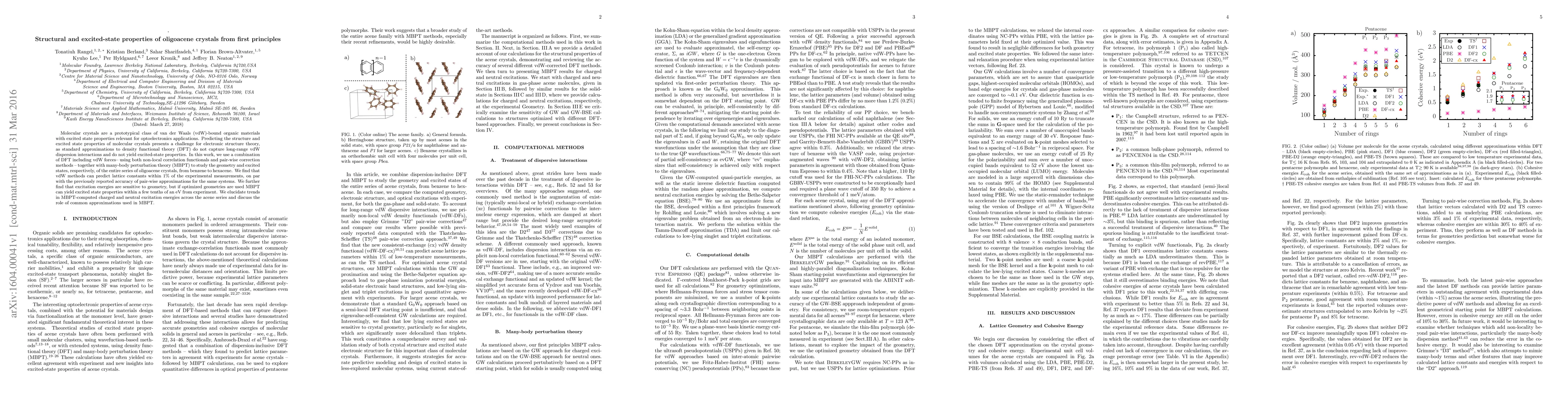 Molecular crystals are a prototypical class of van der Waals (vdW) bound organic materials with excited state properties relevant for optoelectronics applications. Predicting the structure and excited state properties of molecular crystals presents a challenge for electronic structure theory, as standard approximations to density functional theory (DFT) do not capture long range vdW dispersion interactions and do not yield excited state properties. In this work, we use a combination of DFT including vdW forces) using both non local correlation functionals and pair wise correction methods (together with many body perturbation theory (MBPT) to study the geometry and excited states, respectively, of the entire series of oligoacene crystals, from benzene to hexacene. We find that vdW methods can predict lattice constants within 1 percent of the experimental measurements, on par with the previously reported accuracy of pairwise approximations for the same systems. We further find that excitation energies are sensitive to geometry, but if optimized geometries are used MBPT can yield excited state properties within a few tenths of an eV from experiment. We elucidate trends in MBPT computed charged and neutral excitation energies across the acene series and discuss the role of common approximations used in MBPT.
