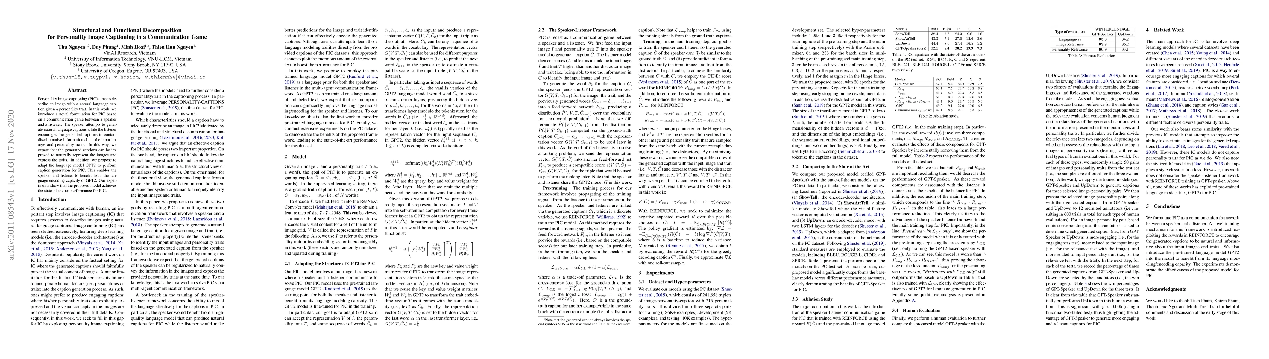 Personality image captioning (PIC) aims to describe an image with a natural language caption given a personality trait. In this work, we introduce a novel formulation for PIC based on a communication game between a speaker and a listener. The speaker attempts to generate natural language captions while the listener encourages the generated captions to contain discriminative information about the input images and personality traits. In this way, we expect that the generated captions can be improved to naturally represent the images and express the traits. In addition, we propose to adapt the language model GPT2 to perform caption generation for PIC. This enables the speaker and listener to benefit from the language encoding capacity of GPT2. Our experiments show that the proposed model achieves the state-of-the-art performance for PIC.