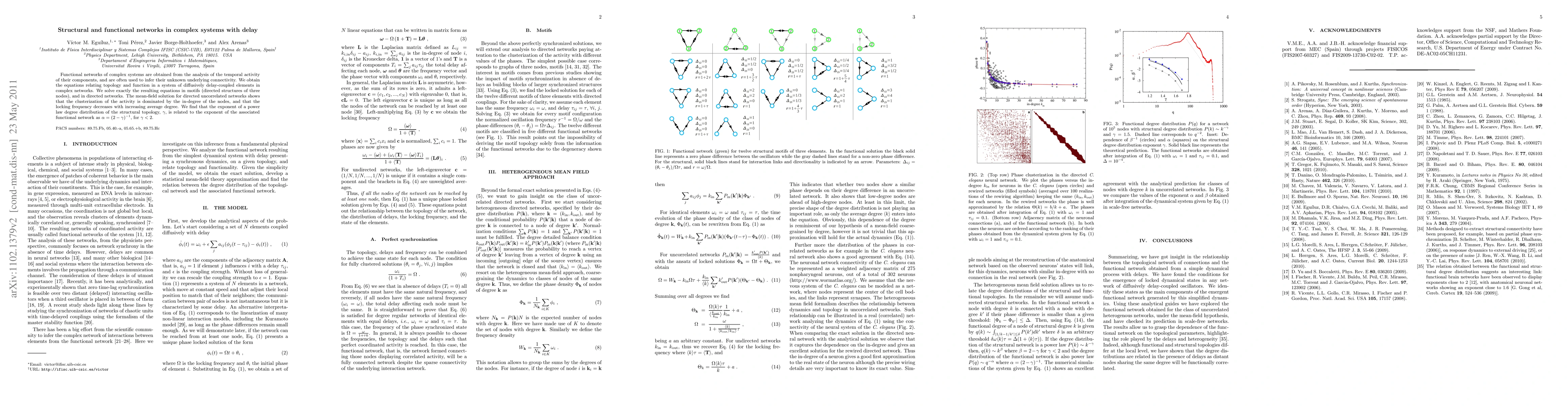 Functional networks of complex systems are obtained from the analysis of the temporal activity of their components, and are often used to infer their unknown underlying connectivity. We obtain the equations relating topology and function in a system of diffusively delay-coupled elements in complex networks. We solve exactly the resulting equations in motifs (directed structures of three nodes), and in directed networks. The mean-field solution for directed uncorrelated networks shows that the clusterization of the activity is dominated by the in-degree of the nodes, and that the locking frequency decreases with increasing average degree. We find that the exponent of a power law degree distribution of the structural topology, b, is related to the exponent of the associated functional network as a =1/(2-b), for b < 2.