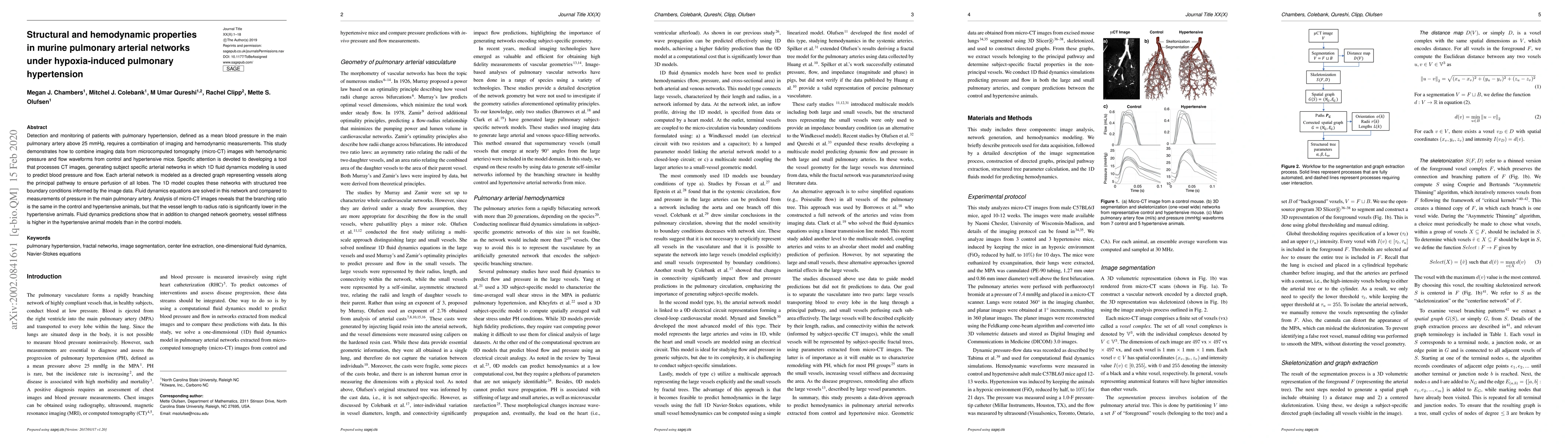 This study combines micro-CT imaging and hemodynamic data to model pulmonary arterial networks in mice, revealing that hypertensive models exhibit lower vessel length to radius ratios and higher vessel stiffness compared to controls, impacting blood pressure and flow predictions.