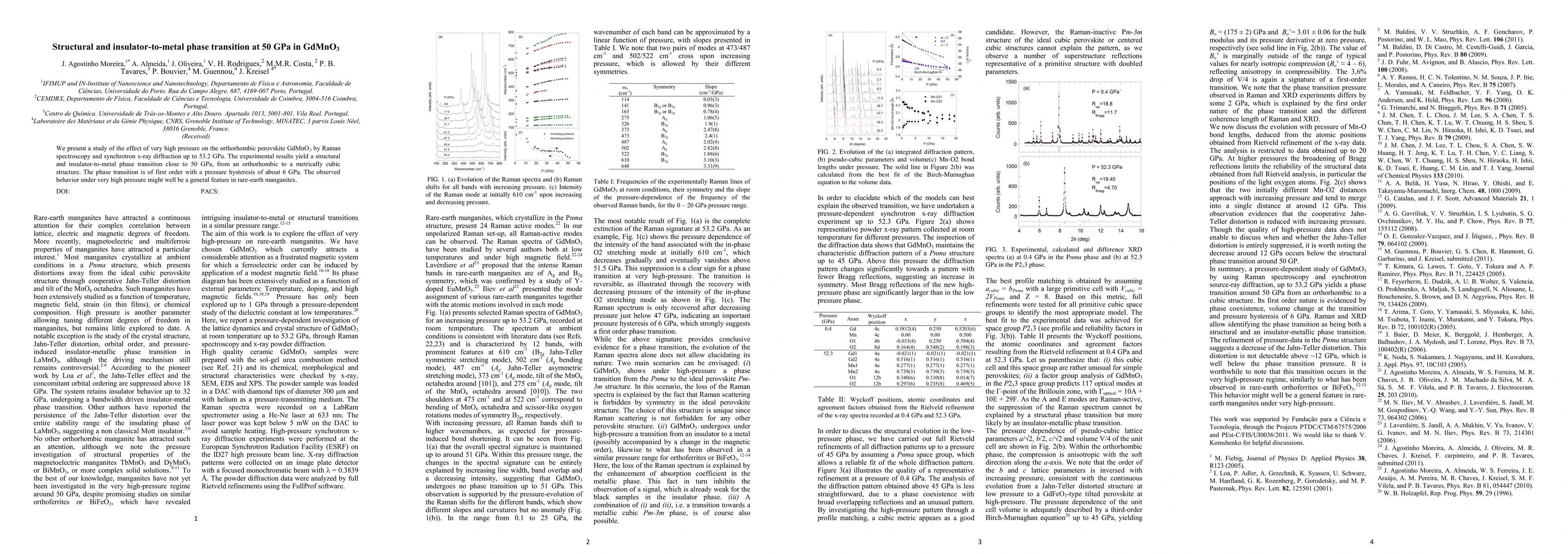 This study reveals a structural and insulator-to-metal phase transition in GdMnO3 at around 50 GPa, transitioning from orthorhombic to cubic structure, observed via Raman spectroscopy and synchrotron x-ray diffraction. The transition is first-order with a notable 6 GPa pressure hysteresis.