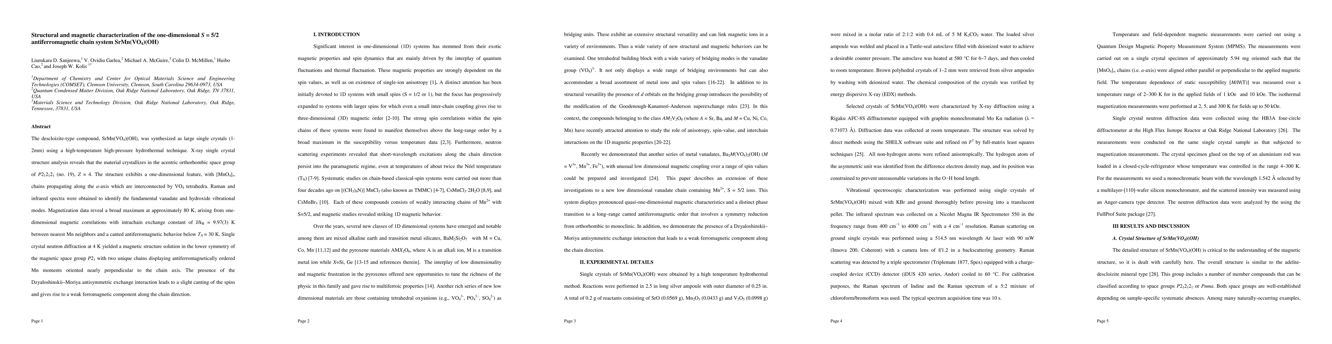 The descloizite-type compound, SrMn(VO4)(OH), was synthesized as large single crystals using a high-temperature high-pressure hydrothermal technique. X-ray single crystal structure analysis reveals that the material crystallizes in the acentric orthorhombic space group of P212121. The structure exhibits a one-dimensional feature, with MnO4 chains propagating along the a-axis which are interconnected by VO4 tetrahedra. Raman and infrared spectra were obtained to identify the fundamental vanadate and hydroxide vibrational modes. Magnetization data reveal a broad maximum at approximately 80 K, arising from one-dimensional magnetic correlations with intrachain exchange constant of J/kB = 9.97(3) K between nearest Mn neighbors and a canted antiferromagnetic behavior below TN = 30 K. Single crystal neutron diffraction at 4 K yielded a magnetic structure solution in the lower symmetry of the magnetic space group P21 with two unique chains displaying antiferromagnetically ordered Mn moments oriented nearly perpendicular to the chain axis. The presence of the Dzyaloshinskii Moriya antisymmetric exchange interaction leads to a slight canting of the spins and gives rise to a weak ferromagnetic component along the chain direction.