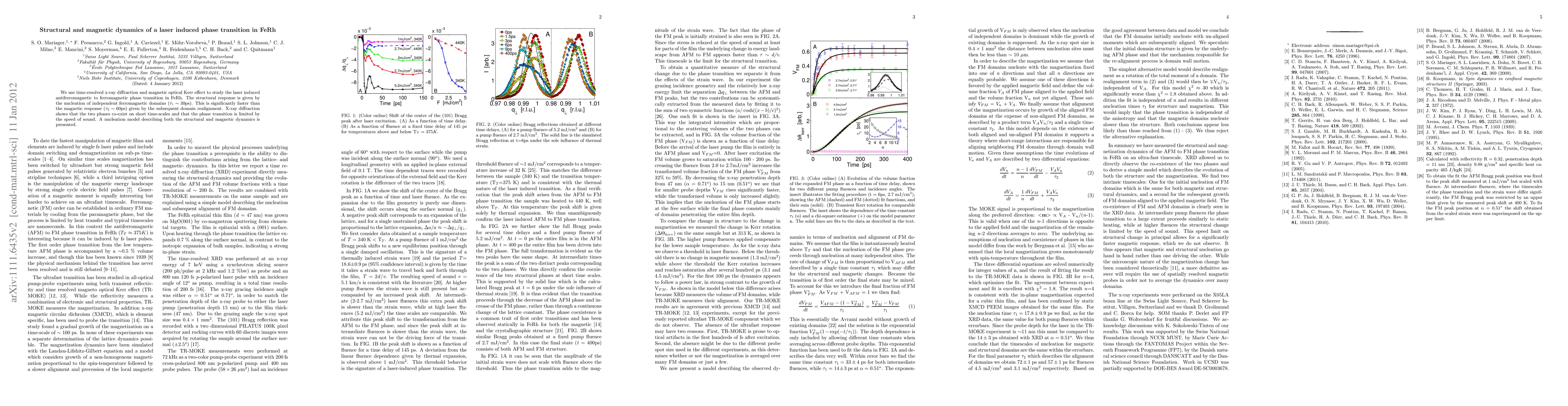 This paper investigates the laser-induced phase transition in FeRh using time-resolved x-ray diffraction and magnetic optical Kerr effect, revealing that structural changes occur faster than magnetic realignment. The study finds that ferromagnetic domains nucleate in ~30ps, while magnetic realignment takes ~60ps, with both phases coexisting briefly before the transition is limited by the speed of sound.