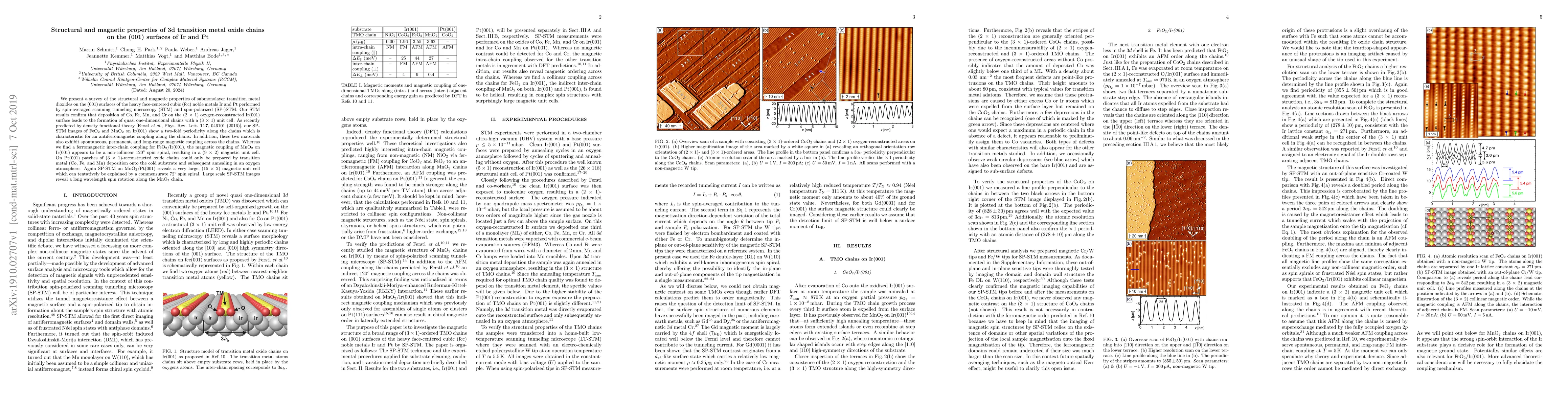 This study investigates the structural and magnetic properties of submonolayer transition metal oxide chains on Ir and Pt (001) surfaces using spin-averaged and spin-polarized scanning tunneling microscopy. It finds quasi-one-dimensional chains with antiferromagnetic coupling and spontaneous magnetic coupling across chains for FeO2 and MnO2 on Ir(001), while MnO2 on Pt(001) exhibits a large magnetic unit cell indicative of a 72° spin spiral.
