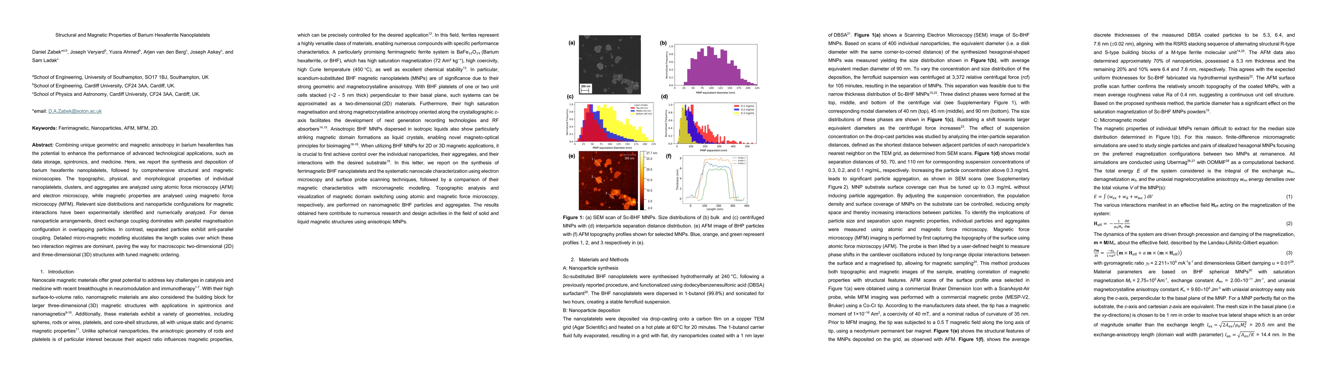 Combining unique geometric and magnetic anisotropy in barium hexaferrites has the potential to enhance the performance of advanced technological applications, such as data storage, spintronics, and medicine. Here, we report the synthesis and deposition of barium hexaferrite nanoplatelets, followed by comprehensive structural and magnetic microscopies. The topographic, physical, and morphological properties of individual nanoplatelets, clusters, and aggregates are analyzed using atomic force microscopy (AFM) and electron microscopy, while magnetic properties are analysed using magnetic force microscopy (MFM). Relevant size distributions and nanoparticle configurations for magnetic interactions have been experimentally identified and numerically analyzed. For dense nanoparticle arrangements, direct exchange coupling dominates with parallel magnetisation configuration in overlapping particles. In contrast, separated particles exhibit anti-parallel coupling. Detailed micro-magnetic modelling elucidates the length scales over which these two interaction regimes are dominant, paving the way for macroscopic two-dimensional (2D) and three-dimensional (3D) structures with tuned magnetic ordering.