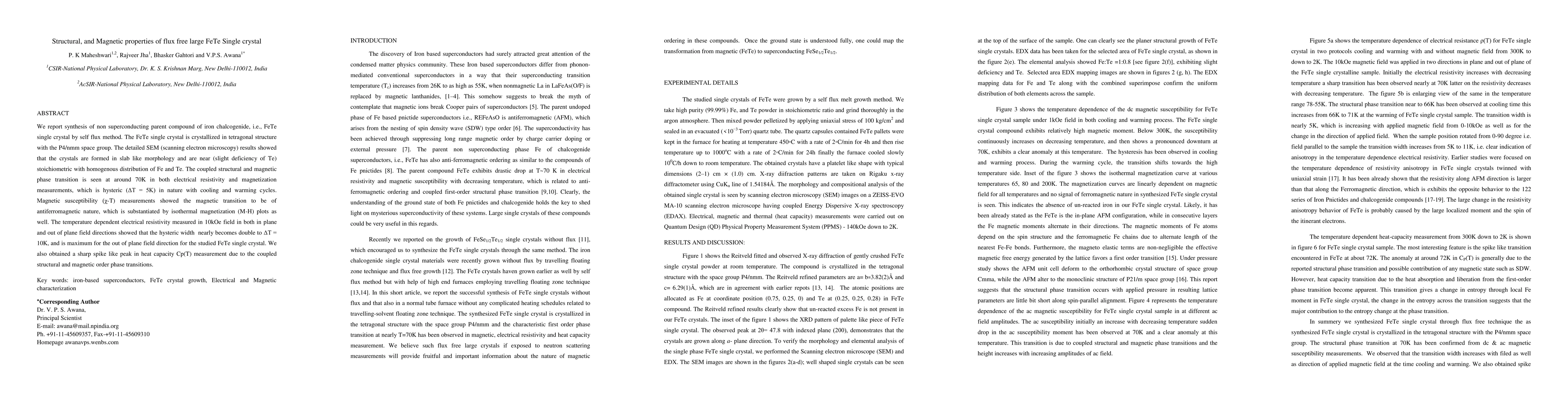 We report synthesis of non superconducting parent compound of iron chalcogenide, i.e., FeTe single crystal by self flux method. The FeTe single crystal is crystallized in tetragonal structure with the P4/nmm space group. The detailed SEM (scanning electron microscopy) results showed that the crystals are formed in slab like morphology and are near (slight deficiency of Te) stoichiometric with homogenous distribution of Fe and Te. The coupled structural and magnetic phase transition is seen at around 70K in both electrical resistivity and magnetization measurements, which is hysteric (deltaT = 5K) in nature with cooling and warming cycles. Magnetic susceptibility (chi-T) measurements showed the magnetic transition to be of antiferromagnetic nature, which is substantiated by isothermal magnetization (M-H) plots as well. The temperature dependent electrical resistivity measured in 10kOe field in both in plane and out of plane field directions showed that the hysteric width nearly becomes double to deltaT = 10K, and is maximum for the out of plane field direction for the studied FeTe single crystal. We also obtained a sharp spike like peak in heat capacity Cp(T) measurement due to the coupled structural and magnetic order phase transitions.