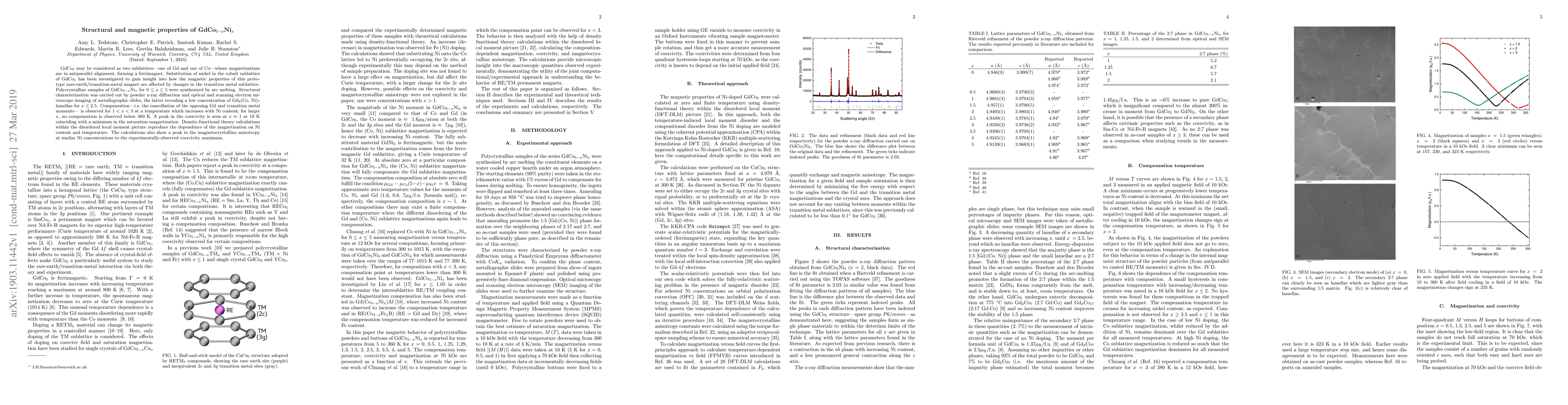 GdCo$_5$ may be considered as two sublattices - one of Gd and one of Co - whose magnetizations are in antiparallel alignment, forming a ferrimagnet. Substitution of nickel in the cobalt sublattice of GdCo$_5$ has been investigated to gain insight into how the magnetic properties of this prototype rare-earth/transition-metal magnet are affected by changes in the transition metal sublattice. Polycrystalline samples of GdCo$_{5-x}$Ni$_x$ for 0 $ \leq x \leq $ 5 were synthesized by arc melting. Structural characterization was carried out by powder x-ray diffraction and optical and scanning electron microscope imaging of metallographic slides, the latter revealing a low concentration of Gd$_2$(Co, Ni)$_7$ lamellae for $x \leq 2.5$. Compensation - i.e. the cancellation of the opposing Gd and transition metal moments is observed for $1 \leq x \leq 3$ at a temperature which increases with Ni content; for larger $x$, no compensation is observed below 360 K. A peak in the coercivity is seen at $x \approx 1$ at 10K coinciding with a minimum in the saturation magnetization. Density-functional theory calculations within the disordered local moment picture reproduce the dependence of the magnetization on Ni content and temperature. The calculations also show a peak in the magnetocrystalline anisotropy at similar Ni concentrations to the experimentally observed coercivity maximum.