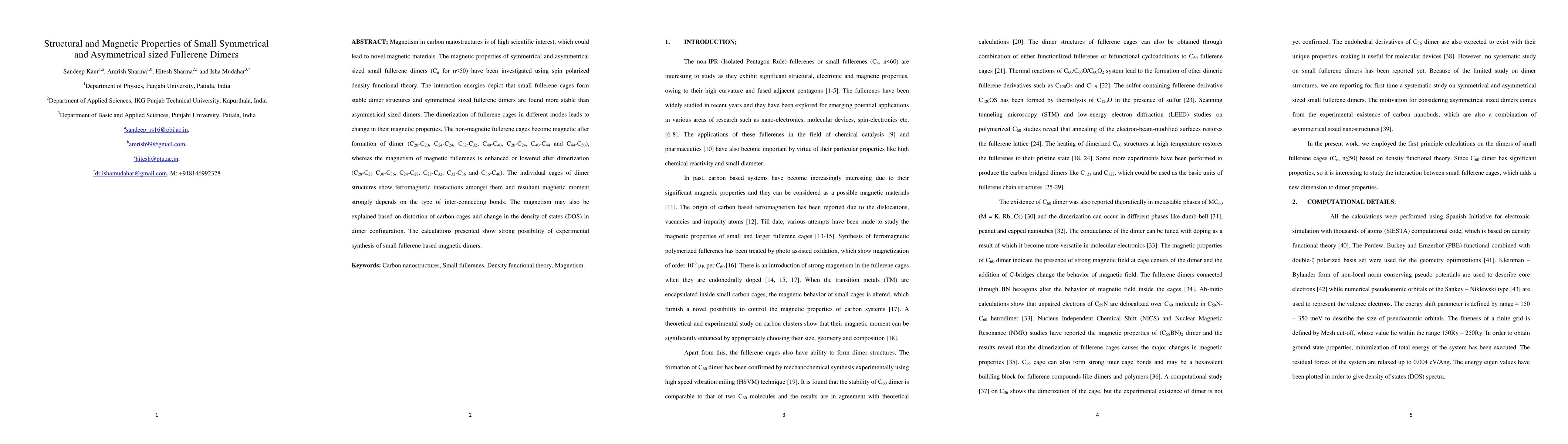 Magnetism in carbon nanostructures is of high scientific interest, which could lead to novel magnetic materials. The magnetic properties of symmetrical and asymmetrical sized small fullerene dimers have been investigated using spin polarized density functional theory. The interaction energies depict that small fullerene cages form stable dimer structures and symmetrical sized fullerene dimers are found more stable than asymmetrical sized dimers. The dimerization of fullerene cages in different modes leads to change in their magnetic properties. The non-magnetic fullerene cages become magnetic after formation of dimer (C20-C20, C24-C24, C32-C32, C40-C40, C20-C24, C40-C44 and C44-C50),whereas the magnetism of magnetic fullerenes is enhanced or lowered after dimerization (C28-C28 C36-C36, C24-C28, C28-C32, C32-C36 and C36-C40). The individual cages of dimer structures show ferromagnetic interactions amongst them and resultant magnetic moment strongly depends on the type of inter-connecting bonds. The magnetism may also be explained based on distortion of carbon cages and change in the density of states (DOS) in dimer configuration. The calculations presented show strong possibility of experimental synthesis of small fullerene based magnetic dimers.