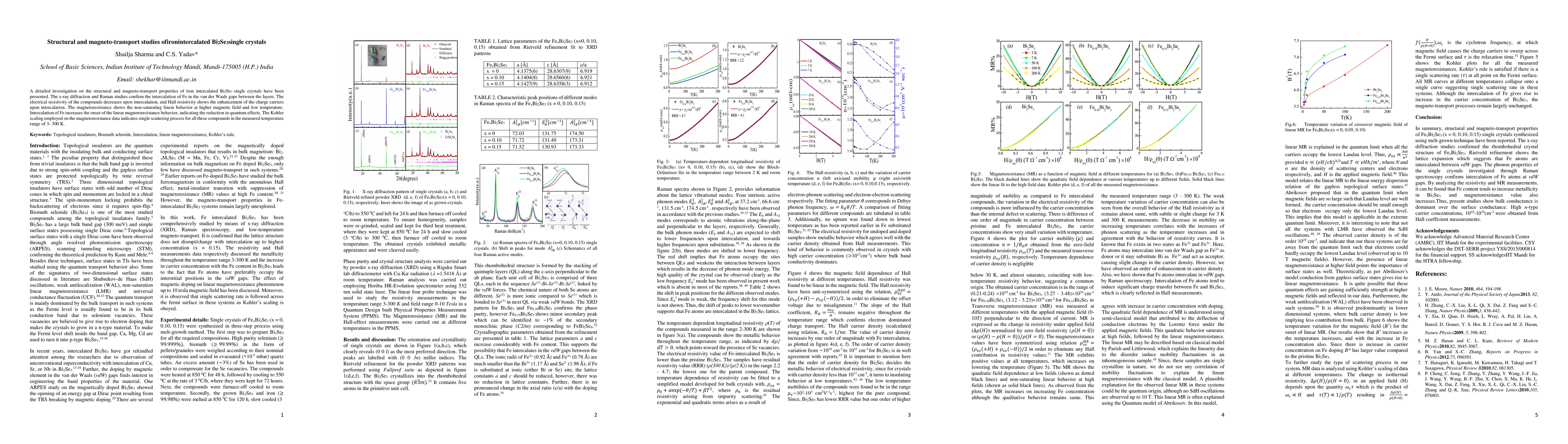 This study investigates the structural and magneto-transport properties of iron-intercalated Bi2Se3 single crystals, confirming Fe intercalation via x-ray diffraction and Raman studies. The electrical resistivity decreases, and magnetoresistance shows non-saturating linear behavior, indicating a reduction in quantum effects due to Fe intercalation.