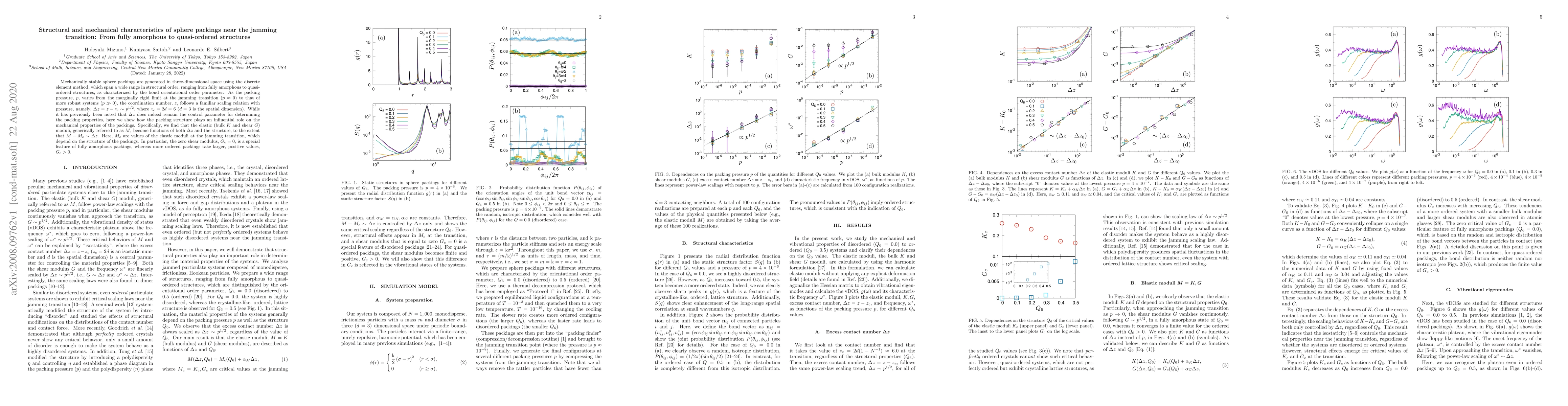 Mechanically stable sphere packings are generated in three-dimensional space using the discrete element method, which span a wide range in structural order, ranging from fully amorphous to quasi-ordered structures, as characterized by the bond orientational order parameter. As the packing pressure, $p$, varies from the marginally rigid limit at the jamming transition ($p \approx 0$) to that of more robust systems ($p \gg 0$), the coordination number, $z$, follows a familiar scaling relation with pressure, namely, $\Delta z = z - z_c \sim p^{1/2}$, where $z_c = 2d = 6$ ($d=3$ is the spatial dimension). While it has previously been noted that $\Delta z$ does indeed remain the control parameter for determining the packing properties, here we show how the packing structure plays an influential role on the mechanical properties of the packings. Specifically, we find that the elastic (bulk $K$ and shear $G$) moduli, generically referred to as $M$, become functions of both $\Delta z$ and the structure, to the extent that $M-M_c \sim \Delta z$. Here, $M_c$ are values of the elastic moduli at the jamming transition, which depend on the structure of the packings. In particular, the zero shear modulus, $G_c=0$, is a special feature of fully amorphous packings, whereas more ordered packings take larger, positive values, $G_c > 0$.