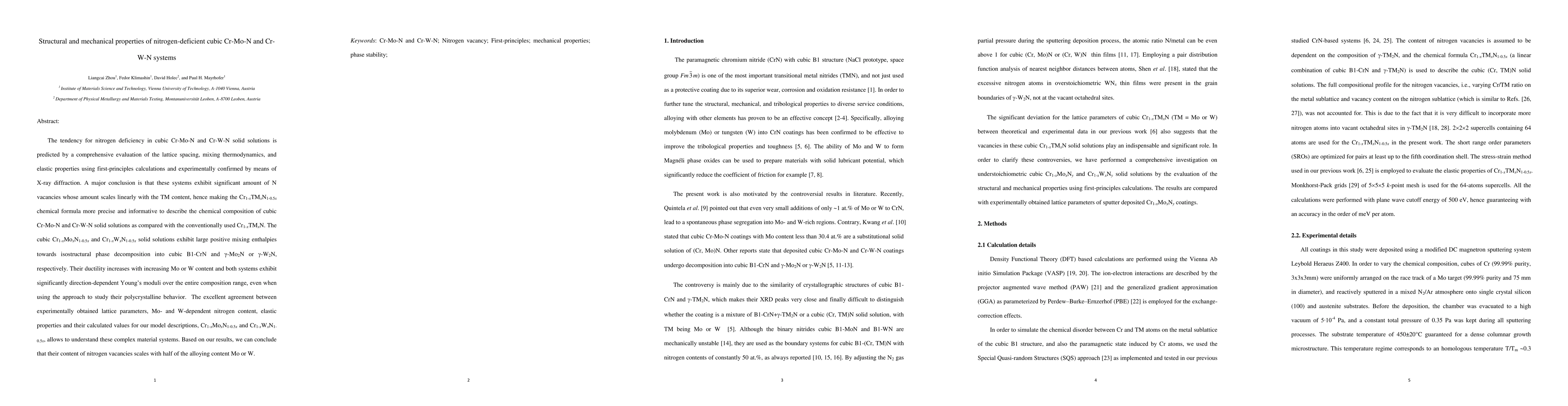 This study investigates nitrogen-deficient cubic Cr-Mo-N and Cr-W-N solid solutions, revealing significant N vacancies scaling linearly with TM content, thus refining the chemical formula to Cr1-xTMxN1-0.5x. The systems show increased ductility with higher Mo or W content and exhibit direction-dependent Young's moduli, with excellent agreement between experimental and calculated properties.