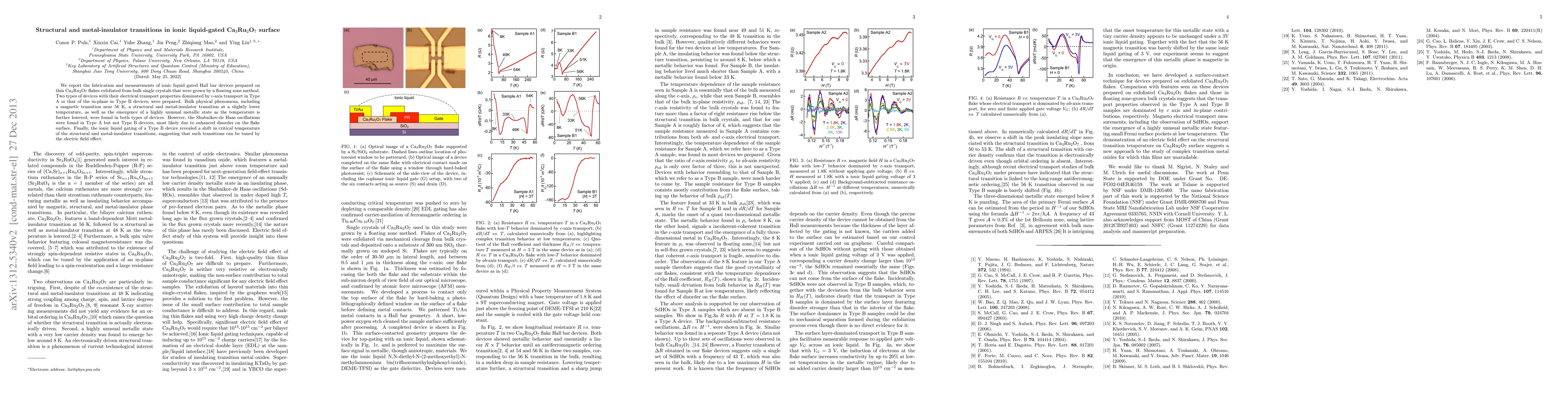 We report the fabrication and measurements of ionic liquid gated Hall bar devices prepared on thin Ca$_3$Ru$_2$O$_7$ flakes exfoliated from bulk single crystals that were grown by a floating zone method. Two types of devices with their electrical transport properties dominated by $c$-axis transport in Type A or that of the in-plane in Type B devices, were prepared. Bulk physical phenomena, including a magnetic transition near 56 K, a structural and metal-insulator transition at a slightly lower temperature, as well as the emergence of a highly unusual metallic state as the temperature is further lowered, were found in both types of devices. However, the Shubnikov-de Haas oscillations were found in Type A but not Type B devices, most likely due to enhanced disorder on the flake surface. Finally, the ionic liquid gating of a Type B device revealed a shift in critical temperature of the structural and metal-insulator transitions, suggesting that such transitions can be tuned by the electric field effect.