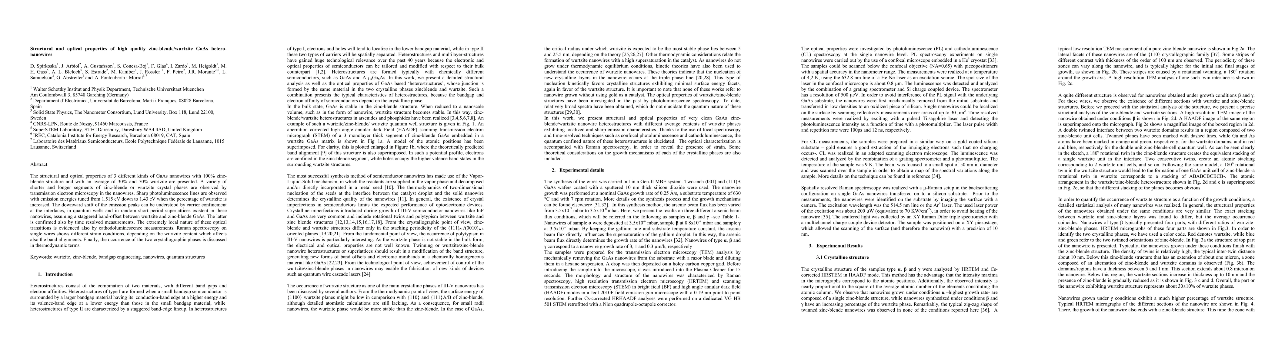 The structural and optical properties of 3 different kinds of GaAs nanowires with 100% zinc-blende structure and with an average of 30% and 70% wurtzite are presented. A variety of shorter and longer segments of zinc-blende or wurtzite crystal phases are observed by transmission electron microscopy in the nanowires. Sharp photoluminescence lines are observed with emission energies tuned from 1.515 eV down to 1.43 eV when the percentage of wurtzite is increased. The downward shift of the emission peaks can be understood by carrier confinement at the interfaces, in quantum wells and in random short period superlattices existent in these nanowires, assuming a staggered band-offset between wurtzite and zinc-blende GaAs. The latter is confirmed also by time resolved measurements. The extremely local nature of these optical transitions is evidenced also by cathodoluminescence measurements. Raman spectroscopy on single wires shows different strain conditions, depending on the wurtzite content which affects also the band alignments. Finally, the occurrence of the two crystallographic phases is discussed in thermodynamic terms.