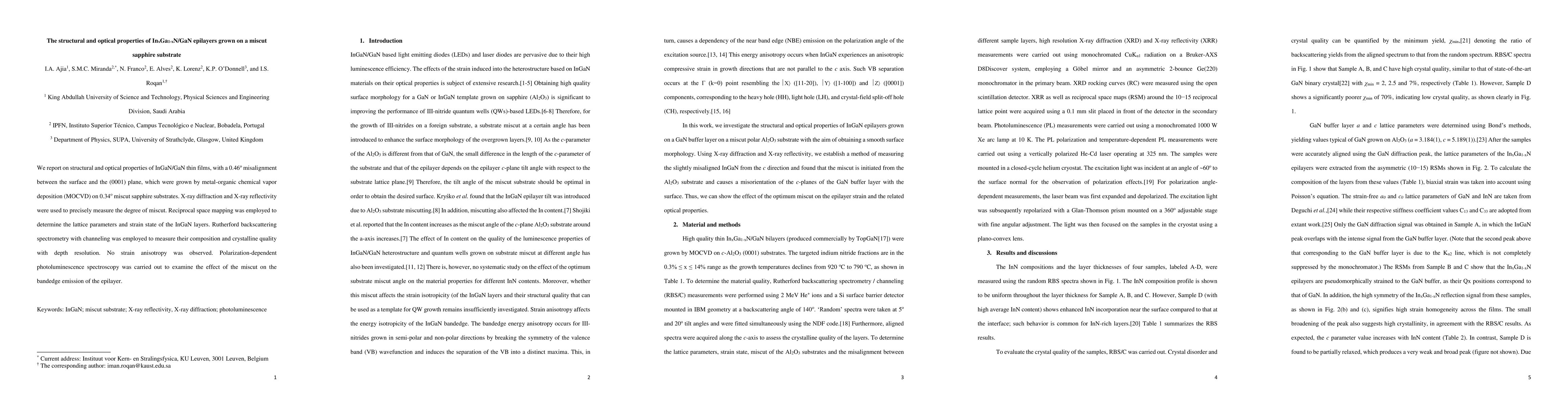 We report on structural and optical properties of InGaN/GaN thin films, with a 0.46o misalignment between the surface and the (0001) plane, which were grown by metal-organic chemical vapor deposition (MOCVD) on 0.34o miscut sapphire substrates. X-ray diffraction and X-ray reflectivity were used to precisely measure the degree of miscut. Reciprocal space mapping was employed to determine the lattice parameters and strain state of the InGaN layers. Rutherford backscattering spectrometry with channeling was employed to measure their composition and crystalline quality with depth resolution. No strain anisotropy was observed. Polarization-dependent photoluminescence spectroscopy was carried out to examine the effect of the miscut on the bandedge emission of the epilayer.