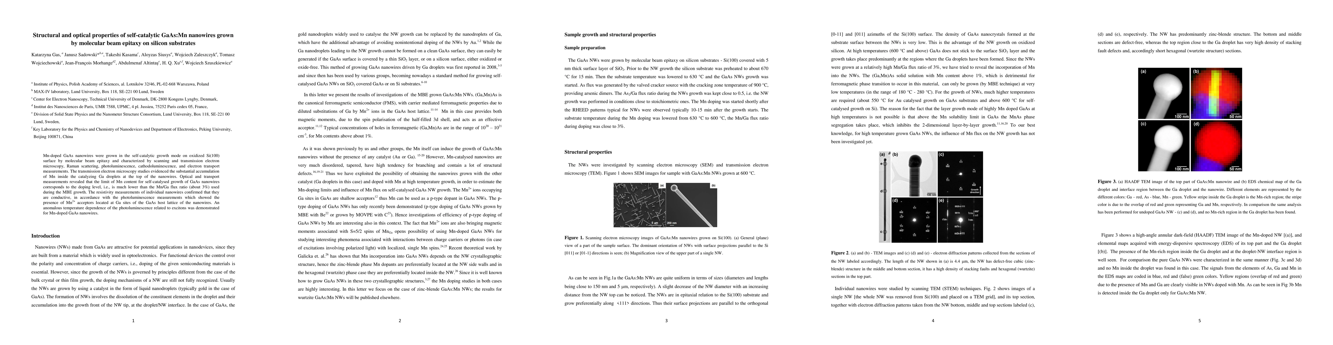 This study investigates Mn-doped GaAs nanowires grown via self-catalytic molecular beam epitaxy on silicon substrates, revealing significant Mn accumulation in Ga droplets and a low Mn doping level (about 3%). The nanowires exhibit conductivity and anomalous temperature-dependent photoluminescence due to Mn2+ acceptors.