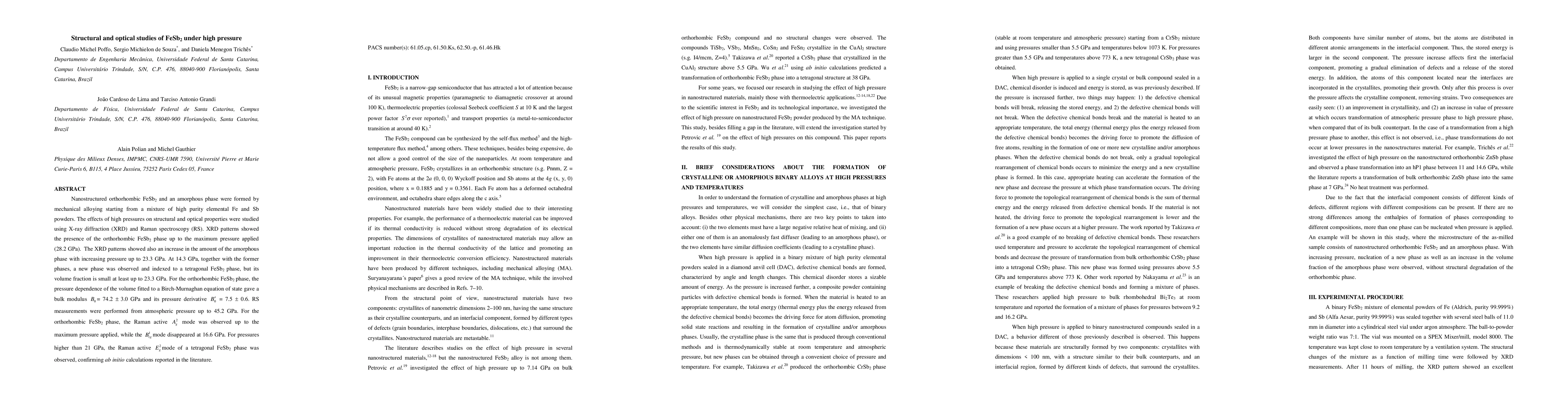 Nanostructured orthorhombic FeSb2 and an amorphous phase were formed by mechanical alloying starting from a mixture of high purity elemental Fe and Sb powders. The effects of high pressures on structural and optical properties were studied using X-ray diffraction (XRD) and Raman spectroscopy (RS). XRD patterns showed the presence of the orthorhombic FeSb2 phase up to the maximum pressure applied (28.2 GPa). The XRD patterns showed also an increase in the amount of the amorphous phase with increasing pressure up to 23.3 GPa. At 14.3 GPa, together with the former phases, a new phase was observed and indexed to a tetragonal FeSb2 phase, but its volume fraction is small at least up to 23.3 GPa. For the orthorhombic FeSb2 phase, the pressure dependence of the volume fitted to a Birch-Murnaghan equation of state gave a bulk modulus = 74.2 +- 3.0 GPa and its pressure derivative = 7.5 +- 0.6. RS measurements were performed from atmospheric pressure up to 45.2 GPa. For the orthorhombic FeSb2 phase, the Raman active mode was observed up to the maximum pressure applied, while the mode disappeared at 16.6 GPa. For pressures higher than 21 GPa, the Raman active mode of a tetragonal FeSb2 phase was observed, confirming ab initio calculations reported in the literature.