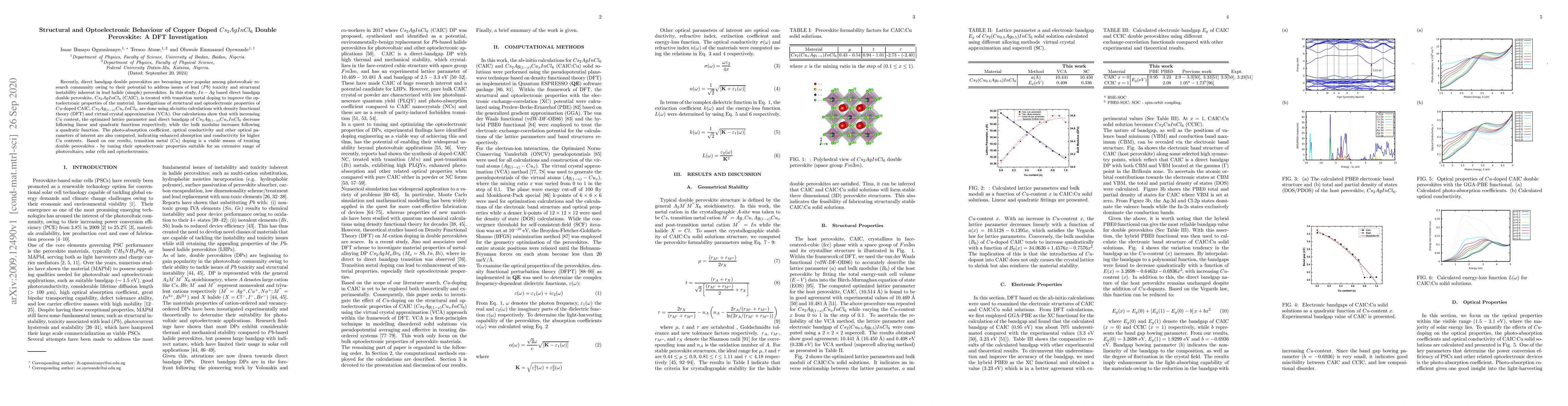 This study investigates the structural and optoelectronic properties of Cu-doped Cs2AgInCl6 using DFT calculations. Results show that Cu doping decreases the lattice parameter and direct bandgap while enhancing absorption and conductivity, suggesting it as a viable method to tailor double perovskites for photovoltaic applications.