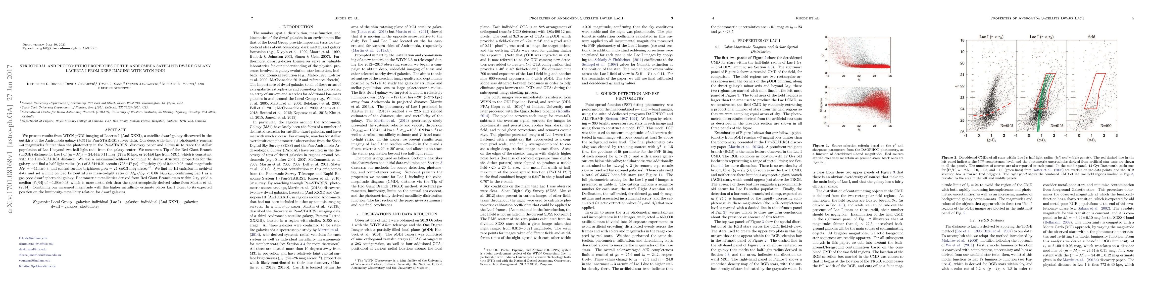 This study uses WIYN pODI imaging to analyze the structural and photometric properties of Lacerta I, a satellite dwarf galaxy of Andromeda. The deep imaging reveals a Tip of the Red Giant Branch distance of 773±40 kpc, a half-light radius of 728±47 pc, and a total magnitude of -11.4±0.3, confirming Lacerta I as a gas-poor dwarf spheroidal galaxy.