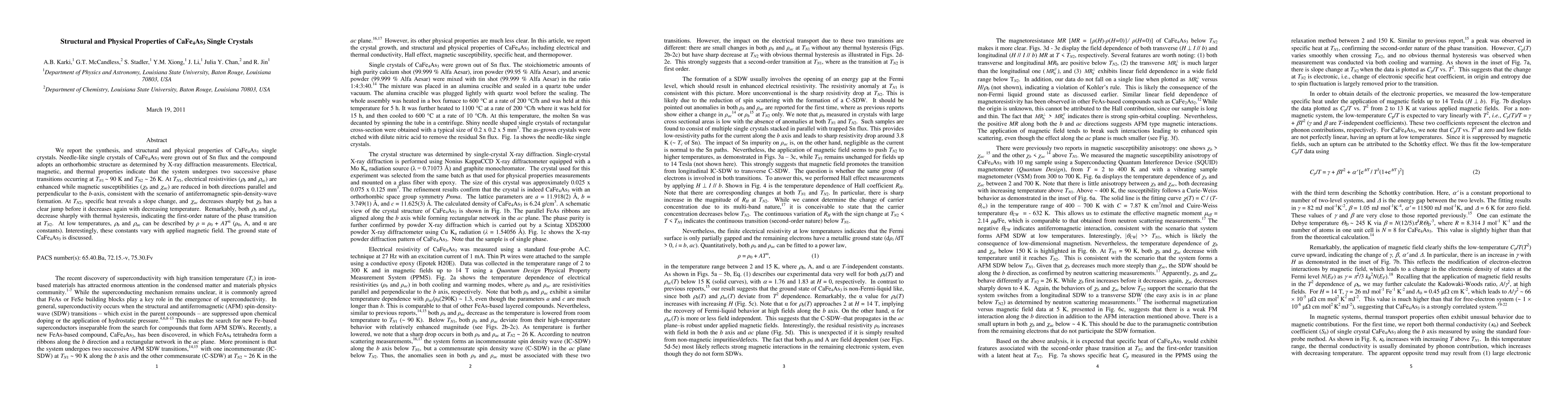 Researchers synthesized CaFe4As3 single crystals and found they undergo two phase transitions at 90K and 26K, with unusual thermal hysteresis in electrical resistivity.