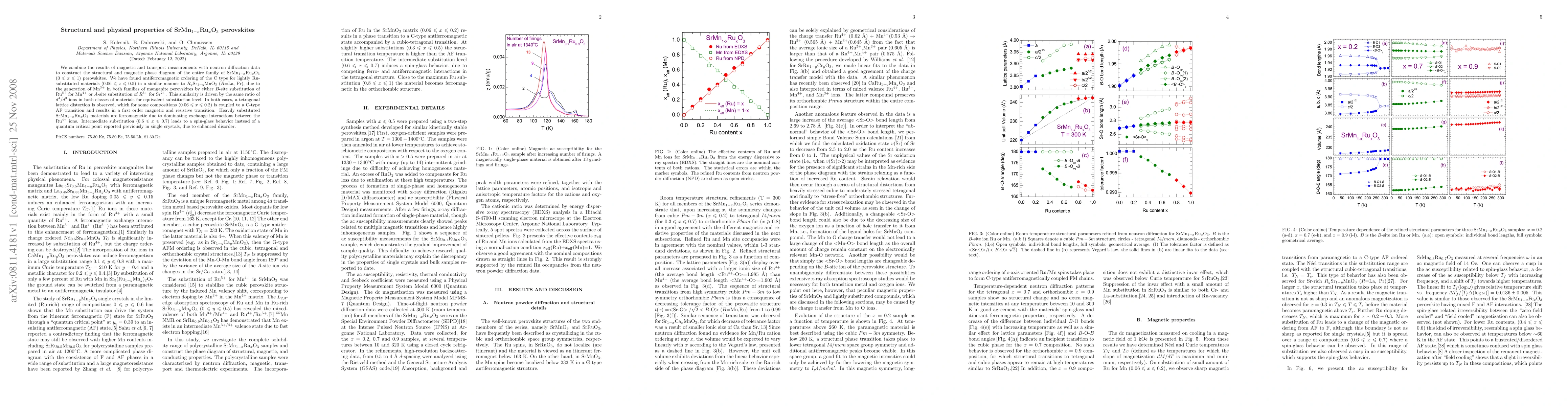 This research constructs the structural and magnetic phase diagram of SrMn$_{1-x}$Ru$_{x}$O$_3$ perovskites, finding antiferromagnetic ordering in lightly Ru-substituted materials due to Mn$^{3+}$ generation, and tetragonal lattice distortion coupled with C-type AF transition in some compositions. Heavily substituted materials are ferromagnetic, while intermediate substitution leads to spin-glass behavior, replacing a previously reported quantum critical point due to enhanced disorder.