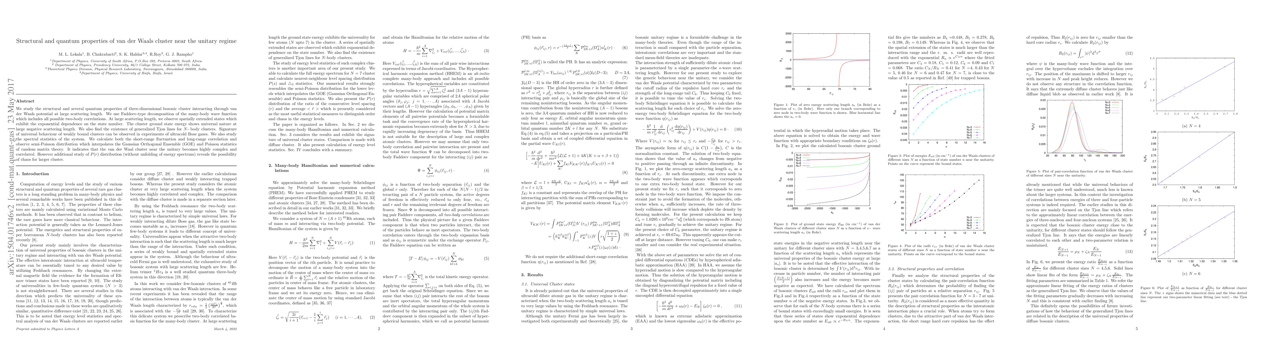 We study the structural and several quantum properties of three-dimensional bosonic cluster interacting through van der Waals potential at large scattering length. We use Faddeev-type decomposition of the many-body wave function which includes all possible two-body correlations. At large scattering length, we observe spatially extended states which exhibit the exponential dependence on the state number. The cluster ground state energy shows universal nature at large negative scattering length. We also find the existence of generalized Tjon lines for $N$- body clusters. Signature of universal behaviour of weakly bound clusters can be observed in experiments of ultracold Bose gases. We also study the spectral statistics of the system. We calculate both the short-range fluctuation and long-range.correlation and observe semi-Poisson distribution which interpolates the Gaussian Orthogonal Ensemble (GOE) and Poisson statistics of random matrix theory. It indicates that the van der Waal cluster near the unitary becomes highly complex and correlated. However additional study of $P(r)$ distribution (without unfolding of energy spectrum) reveals the possibility of chaos for larger cluster.