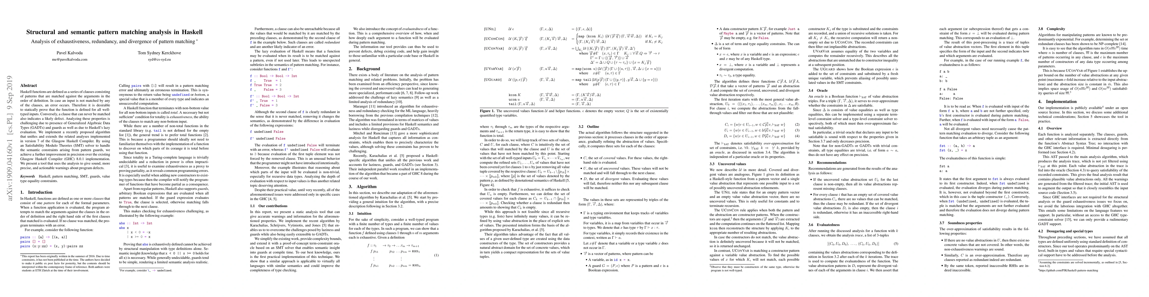 This paper presents an algorithm to statically analyze Haskell functions for completeness and correctness by matching patterns against inputs. It improves upon existing analyses in GHC 8.0.1 using an SMT solver for semantic constraints, providing more precise warnings about potential defects.