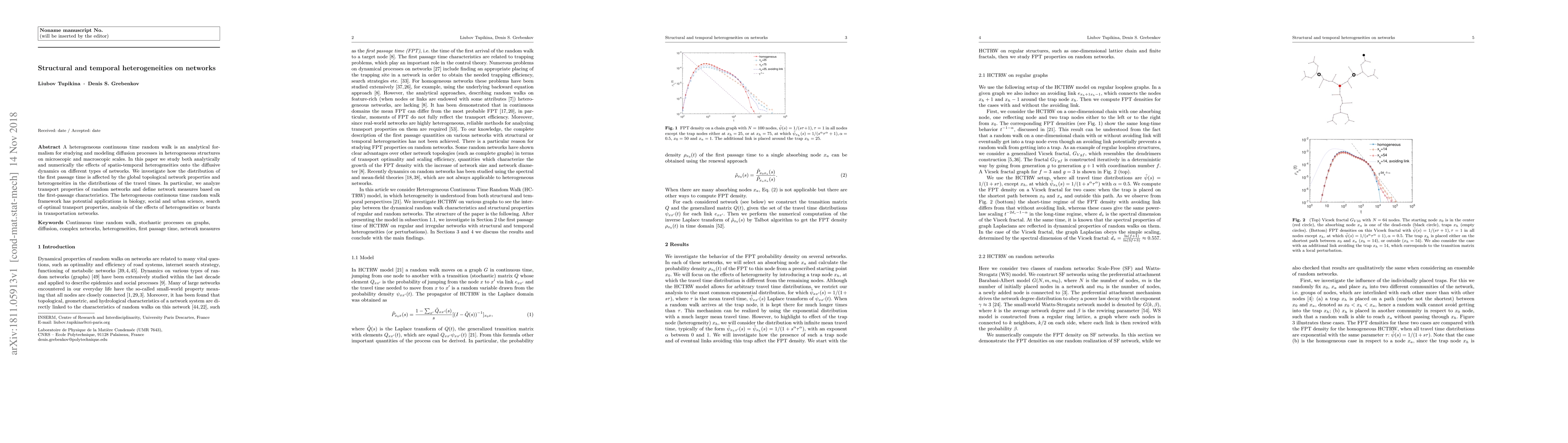 A heterogeneous continuous time random walk is an analytical formalism for studying and modeling diffusion processes in heterogeneous structures on microscopic and macroscopic scales. In this paper we study both analytically and numerically the effects of spatio-temporal heterogeneities onto the diffusive dynamics on different types of networks. We investigate how the distribution of the first passage time is affected by the global topological network properties and heterogeneities in the distributions of the travel times. In particular, we analyze transport properties of random networks and define network measures based on the first-passage characteristics. The heterogeneous continuous time random walk framework has potential applications in biology, social and urban science, search of optimal transport properties, analysis of the effects of heterogeneities or bursts in transportation networks.
