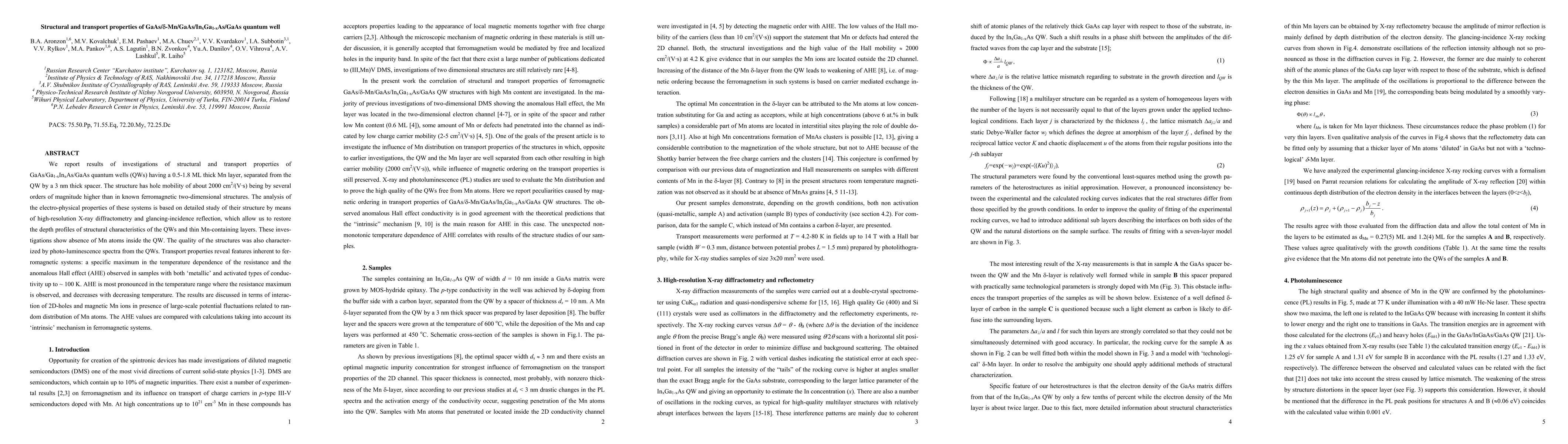 This paper investigates the structural and transport properties of GaAs/Ga(1-x)In(x)As/GaAs quantum wells with a thin Mn layer, revealing high hole mobility and ferromagnetic features such as the anomalous Hall effect, with Mn atoms found outside the quantum wells.