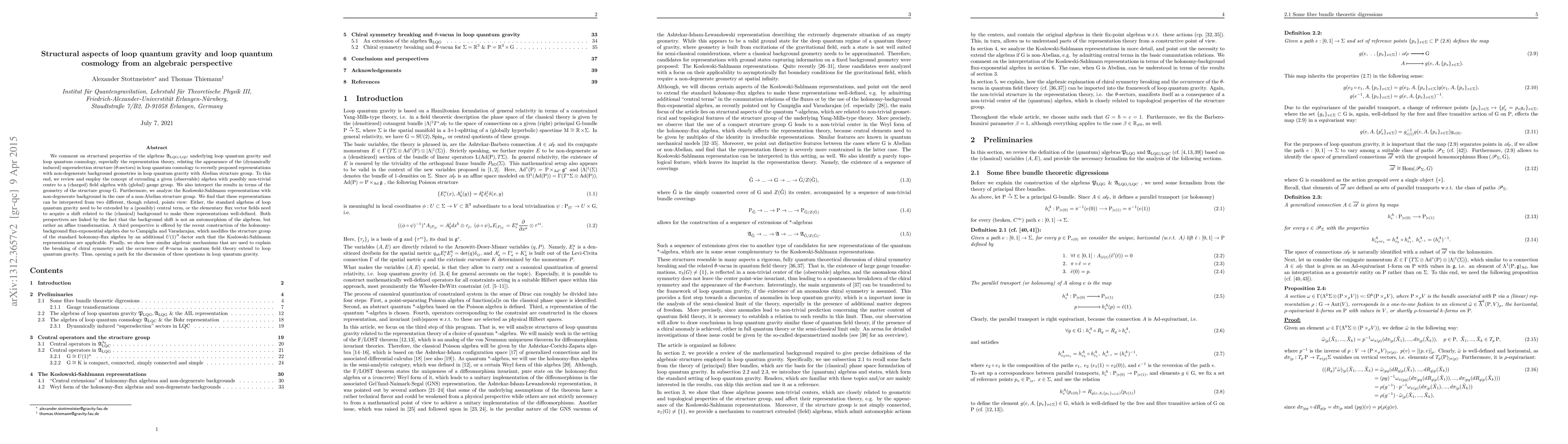 We comment on structural properties of the algebras $\mathfrak{A}_{LQG/LQC}$ underlying loop quantum gravity and loop quantum cosmology, especially the representation theory, relating the appearance of the (dynamically induced) superselection structure ($\theta$-sectors) in loop quantum cosmology to recently proposed representations with non-degenerate background geometries in loop quantum gravity with Abelian structure group. To this end, we review and employ the concept of extending a given (observable) algebra with possibly non-trivial centre to a (charged) field algebra with (global) gauge group.We also interpret the results in terms of the geometry of the structure group G. Furthermore, we analyze the Koslowski-Sahlmann representations with non-degenerate background in the case of a non-Abelian structure group. We find that these representations can be interpreted from two different, though related, points view: Either, the standard algebras of loop quantum gravity need to be extended by a (possibly) central term, or the elementary flux vector fields need to acquire a shift related to the (classical) background to make these representations well-defined. Both perspectives are linked by the fact that the background shift is not an automorphism of the algebras, but rather an affine transformation. Finally, we show how similar algebraic mechanisms, which are used to explain the breaking of chiral symmetry and the occurrence of $\theta$-vacua in quantum field theory, extend to loop quantum gravity. Thus, opening a path for the discussion of these questions in loop quantum gravity.