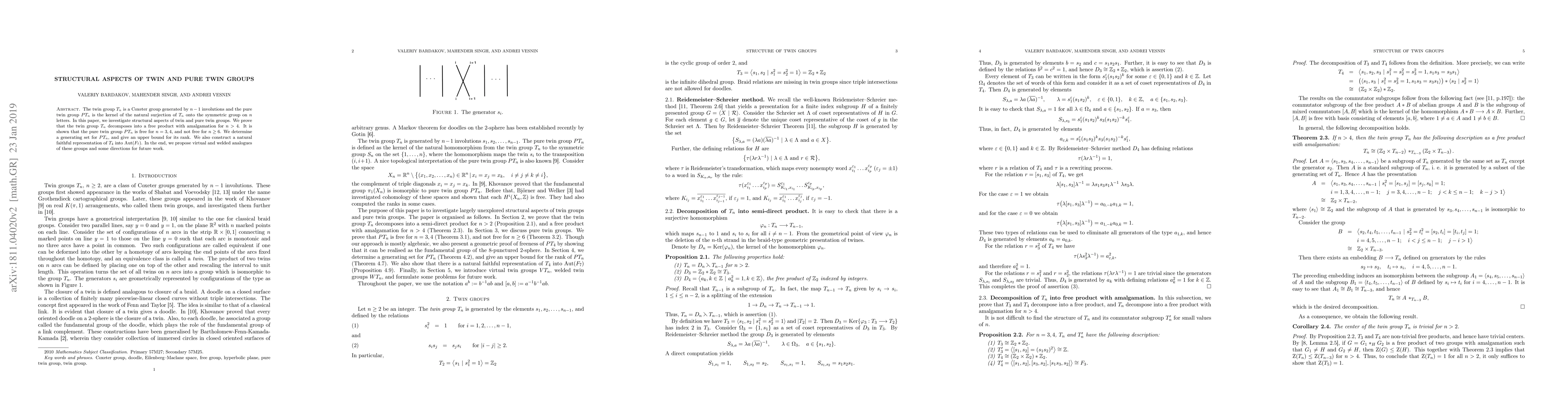 This paper examines the structural properties of twin groups ($T_n$) and pure twin groups ($PT_n$), proving that $T_n$ decomposes into a free product with amalgamation for $n>4$. It demonstrates that $PT_n$ is free for $n=3,4$ but not for $n\ge 6$, providing a generating set and an upper rank bound for $PT_n$, and constructs a faithful representation of $T_4$ into $\operatorname{Aut}(F_7)$.