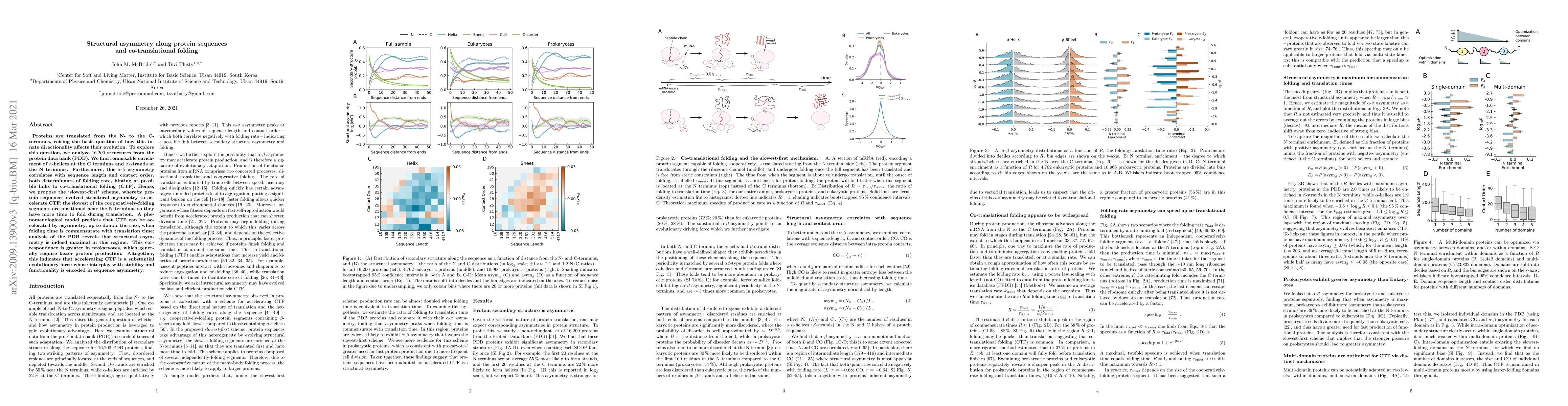 Proteins are translated from the N- to the C-terminus, raising the basic question of how this innate directionality affects their evolution. To explore this question, we analyze 16,200 structures from the protein data bank (PDB). We find remarkable enrichment of $\alpha$-helices at the C terminus and $\beta$-strands at the N terminus. Furthermore, this $\alpha$-$\beta$ asymmetry correlates with sequence length and contact order, both determinants of folding rate, hinting at possible links to co-translational folding (CTF). Hence, we propose the 'slowest-first' scheme, whereby protein sequences evolved structural asymmetry to accelerate CTF: the slowest of the cooperatively-folding segments are positioned near the N terminus so they have more time to fold during translation. A phenomenological model predicts that CTF can be accelerated by asymmetry, up to double the rate, when folding time is commensurate with translation time; analysis of the PDB reveals that structural asymmetry is indeed maximal in this regime. This correspondence is greater in prokaryotes, which generally require faster protein production. Altogether, this indicates that accelerating CTF is a substantial evolutionary force whose interplay with stability and functionality is encoded in sequence asymmetry.