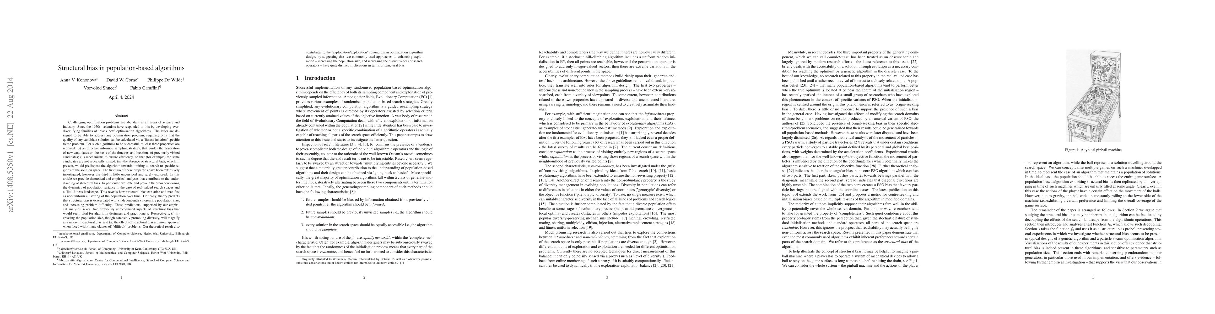 Challenging optimisation problems are abundant in all areas of science. Since the 1950s, scientists have developed ever-diversifying families of black box optimisation algorithms designed to address any optimisation problem, requiring only that quality of a candidate solution is calculated via a fitness function specific to the problem. For such algorithms to be successful, at least three properties are required: an effective informed sampling strategy, that guides generation of new candidates on the basis of fitnesses and locations of previously visited candidates; mechanisms to ensure efficiency, so that same candidates are not repeatedly visited; absence of structural bias, which, if present, would predispose the algorithm towards limiting its search to some regions of solution space. The first two of these properties have been extensively investigated, however the third is little understood. In this article we provide theoretical and empirical analyses that contribute to the understanding of structural bias. We prove a theorem concerning dynamics of population variance in the case of real-valued search spaces. This reveals how structural bias can manifest as non-uniform clustering of population over time. Theory predicts that structural bias is exacerbated with increasing population size and problem difficulty. These predictions reveal two previously unrecognised aspects of structural bias. Respectively, increasing population size, though ostensibly promoting diversity, will magnify any inherent structural bias, and effects of structural bias are more apparent when faced with difficult problems. Our theoretical result also suggests that two commonly used approaches to enhancing exploration, increasing population size and increasing disruptiveness of search operators, have quite distinct implications in terms of structural bias.