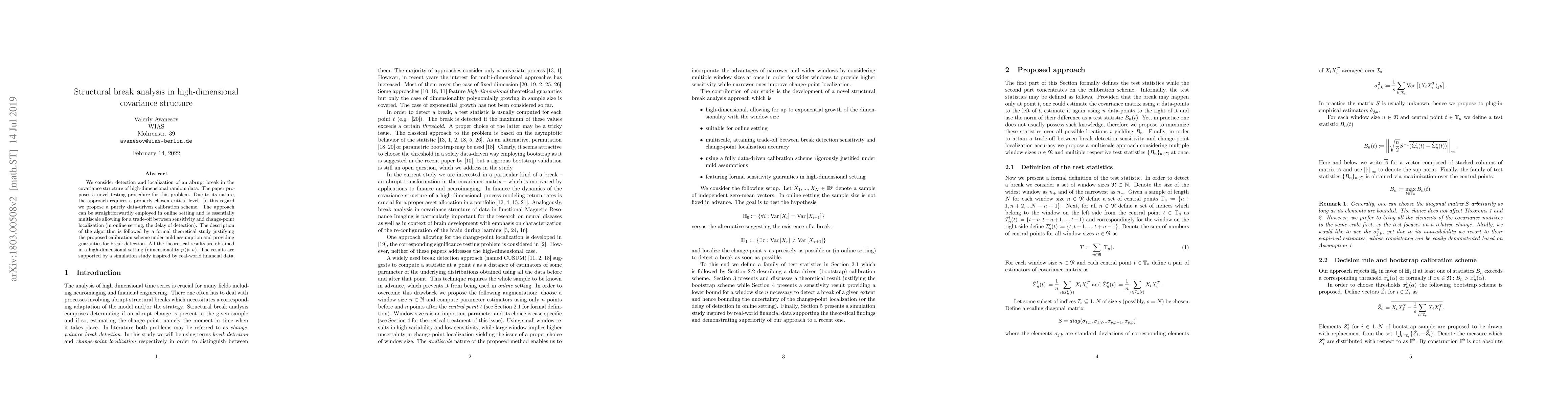 We consider detection and localization of an abrupt break in the covariance structure of high-dimensional random data. The paper proposes a novel testing procedure for this problem. Due to its nature, the approach requires a properly chosen critical level. In this regard we propose a purely data-driven calibration scheme. The approach can be straightforwardly employed in online setting and is essentially multiscale allowing for a trade-off between sensitivity and change-point localization (in online setting, the delay of detection). The description of the algorithm is followed by a formal theoretical study justifying the proposed calibration scheme under mild assumption and providing guaranties for break detection. All the theoretical results are obtained in a high-dimensional setting (dimensionality $p >> n$). The results are supported by a simulation study inspired by real-world financial data.