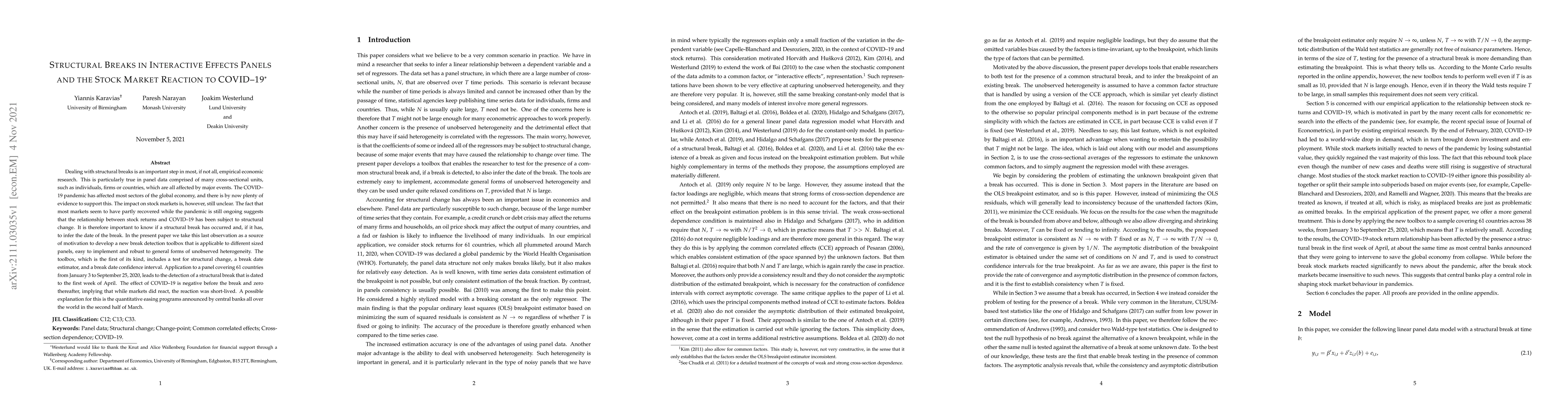 This paper develops a new toolbox for detecting structural breaks in panel data, applying it to stock market reactions to COVID-19. The analysis finds a significant structural break in global stock markets around early April 2020, with negative effects before the break and a short-lived reaction.