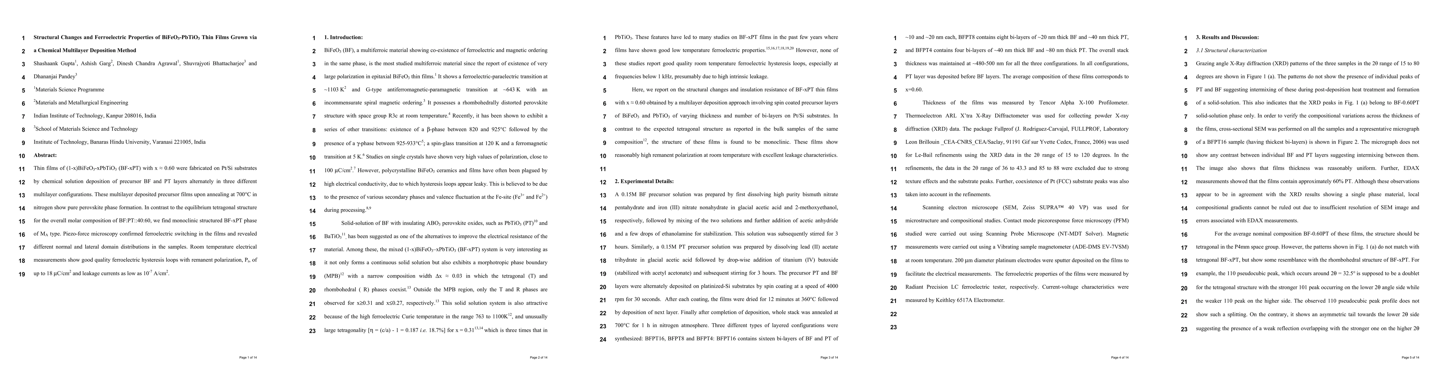 Thin films of (1-x)BiFeO3-xPbTiO3 (BF-xPT) with x ~ 0.60 were fabricated on Pt/Si substrates by chemical solution deposition of precursor BF and PT layers alternately in three different multilayer configurations. These multilayer deposited precursor films upon annealing at 700{\deg}C in nitrogen show pure perovskite phase formation. In contrast to the equilibrium tetragonal structure for the overall molar composition of BF:PT::40:60, we find monoclinic structured BF-xPT phase of MA type. Piezo-force microscopy confirmed ferroelectric switching in the films and revealed different normal and lateral domain distributions in the samples. Room temperature electrical measurements show good quality ferroelectric hysteresis loops with remanent polarization, Pr, of up to 18 {\mu}C/cm2 and leakage currents as low as 10-7 A/cm2.