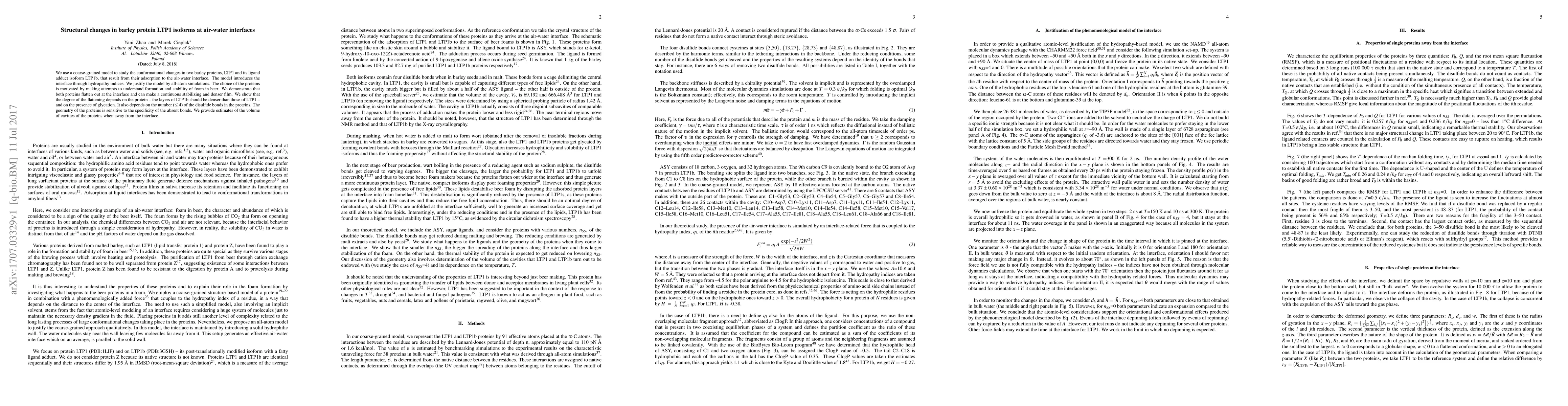 Researchers studied how barley proteins LTP1 and LTP1b change shape when exposed to air-water interfaces, finding that they can form stable films with varying levels of density depending on the protein's structure.