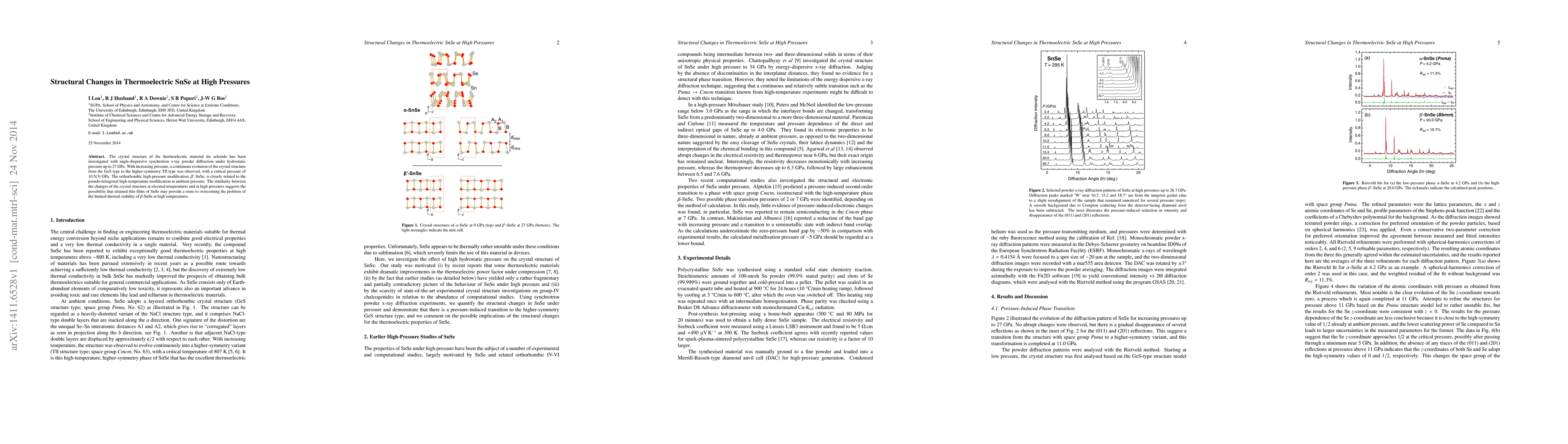 This study investigates the structural changes in thermoelectric SnSe under high pressure using synchrotron x-ray diffraction, revealing a transition from GeS to TlI type at 10.5(3) GPa. The findings suggest that high-pressure modifications may enhance thermal stability in SnSe thin films.
