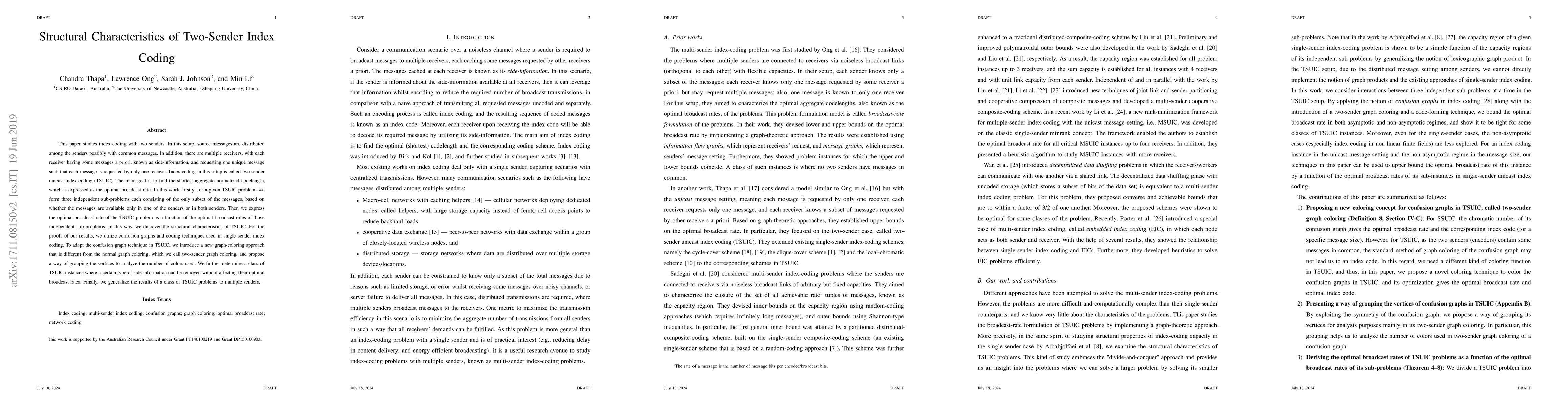 This paper studies index coding with two senders. In this setup, source messages are distributed among the senders possibly with common messages. In addition, there are multiple receivers, with each receiver having some messages a priori, known as side-information, and requesting one unique message such that each message is requested by only one receiver. Index coding in this setup is called two-sender unicast index coding (TSUIC). The main goal is to find the shortest aggregate normalized codelength, which is expressed as the optimal broadcast rate. In this work, firstly, for a given TSUIC problem, we form three independent sub-problems each consisting of the only subset of the messages, based on whether the messages are available only in one of the senders or in both senders. Then we express the optimal broadcast rate of the TSUIC problem as a function of the optimal broadcast rates of those independent sub-problems. In this way, we discover the structural characteristics of TSUIC. For the proofs of our results, we utilize confusion graphs and coding techniques used in single-sender index coding. To adapt the confusion graph technique in TSUIC, we introduce a new graph-coloring approach that is different from the normal graph coloring, which we call two-sender graph coloring, and propose a way of grouping the vertices to analyze the number of colors used. We further determine a class of TSUIC instances where a certain type of side-information can be removed without affecting their optimal broadcast rates. Finally, we generalize the results of a class of TSUIC problems to multiple senders.