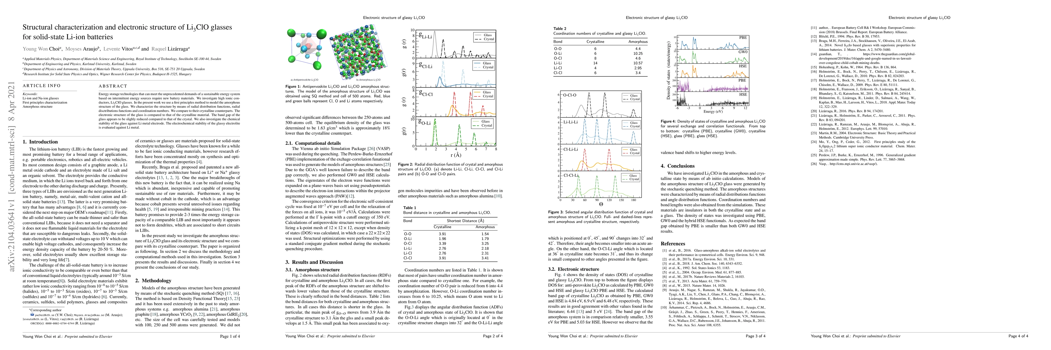 Energy storage technologies that can meet the unprecedented demands of a sustainable energy system based on intermittent energy sources require new battery materials. We investigate high ionic conductors, Li$_3$ClO glasses. In the present work we use a first principles method to model the amorphous structure of the glass. We characterize the structure by means of radial distribution functions, radial disctributions functions and coordination numbers. We compare to their crystalline counterparts. The electronic structure of the glass is compared to that of the crystalline material. The band gap of the glass appears to be slighly reduced compared to that of the crystal. We also investigate the chemical stability of the glass against Li metal electrode. The electrochemical stability of the glassy electrolite is evaluated against Li metal.