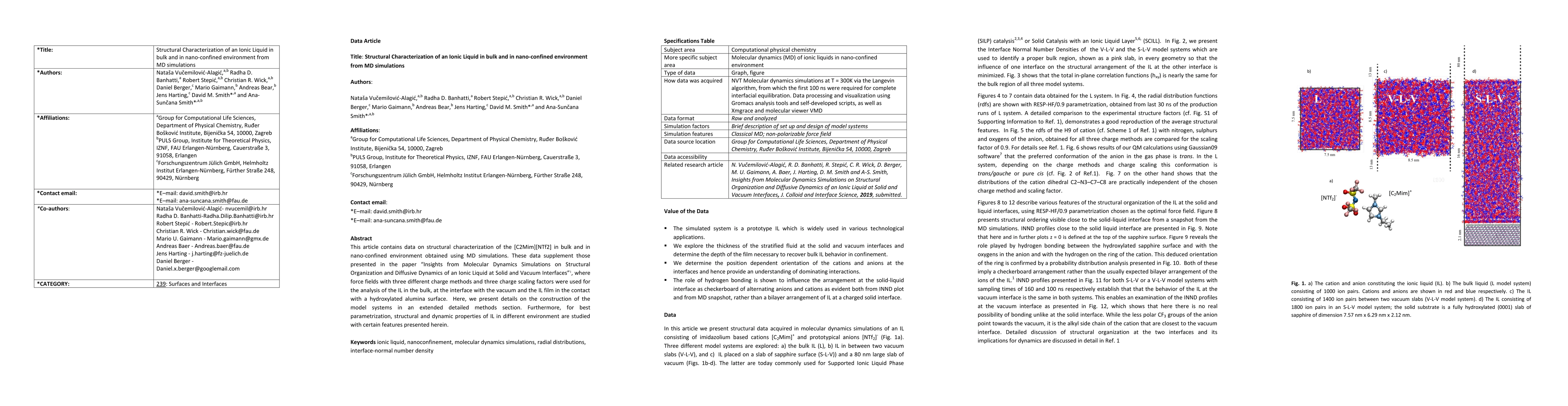 This paper provides detailed MD simulation data on the structural characterization of [C2Mim][NTf2] ionic liquid in bulk and nano-confined environments, expanding on previous work that analyzed its behavior at interfaces. The study focuses on the construction of model systems and the optimization of force fields for accurate representation of the ionic liquid's properties in various environments.