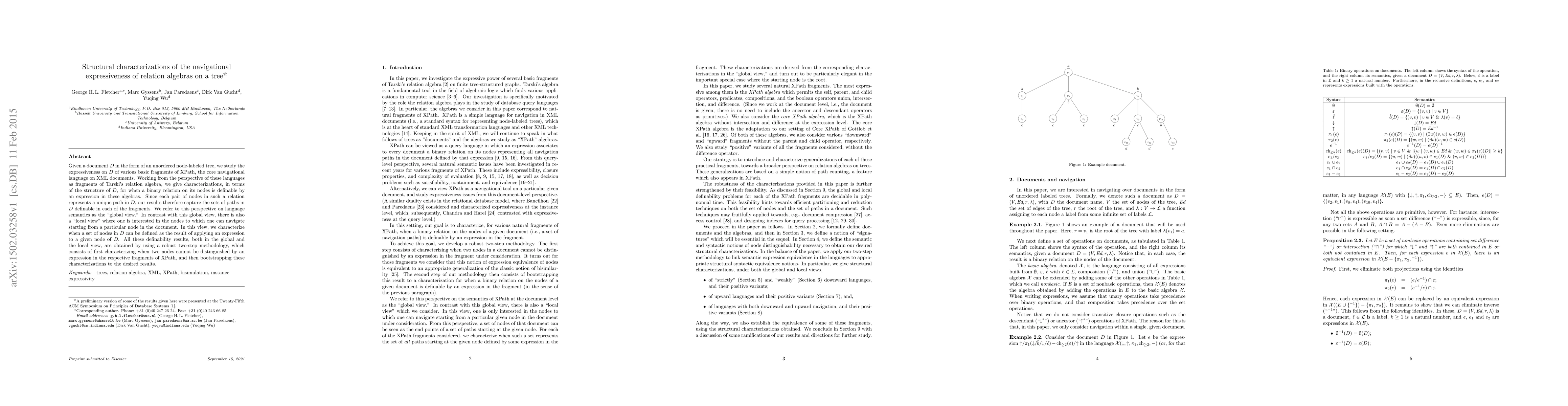Given a document D in the form of an unordered node-labeled tree, we study the expressiveness on D of various basic fragments of XPath, the core navigational language on XML documents. Working from the perspective of these languages as fragments of Tarski's relation algebra, we give characterizations, in terms of the structure of D, for when a binary relation on its nodes is definable by an expression in these algebras. Since each pair of nodes in such a relation represents a unique path in D, our results therefore capture the sets of paths in D definable in each of the fragments. We refer to this perspective on language semantics as the "global view." In contrast with this global view, there is also a "local view" where one is interested in the nodes to which one can navigate starting from a particular node in the document. In this view, we characterize when a set of nodes in D can be defined as the result of applying an expression to a given node of D. All these definability results, both in the global and the local view, are obtained by using a robust two-step methodology, which consists of first characterizing when two nodes cannot be distinguished by an expression in the respective fragments of XPath, and then bootstrapping these characterizations to the desired results.