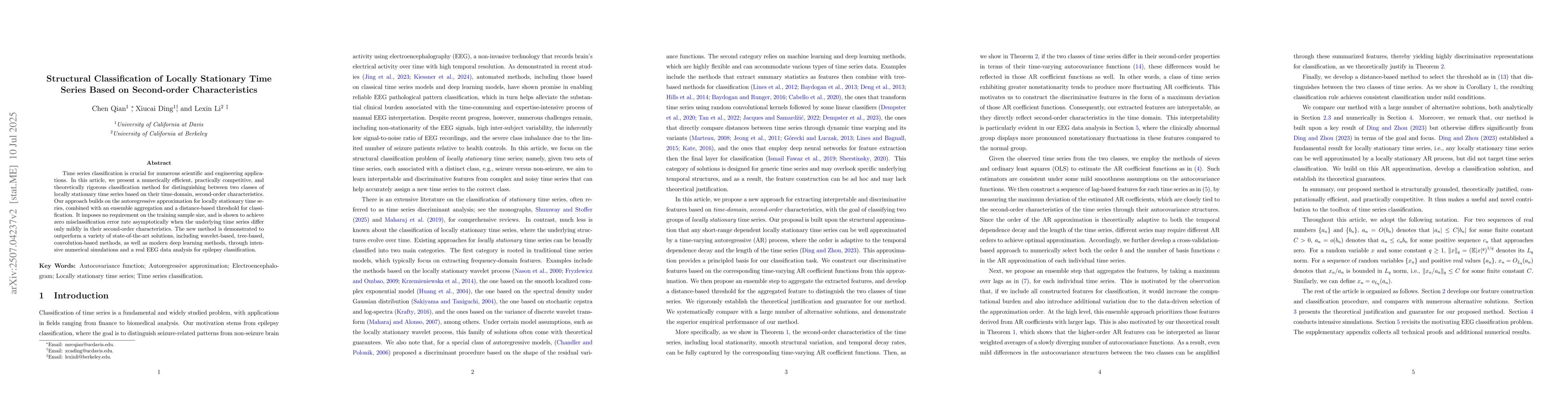 Time series classification is crucial for numerous scientific and engineering applications. In this article, we present a numerically efficient, practically competitive, and theoretically rigorous classification method for distinguishing between two classes of locally stationary time series based on their time-domain, second-order characteristics. Our approach builds on the autoregressive approximation for locally stationary time series, combined with an ensemble aggregation and a distance-based threshold for classification. It imposes no requirement on the training sample size, and is shown to achieve zero misclassification error rate asymptotically when the underlying time series differ only mildly in their second-order characteristics. The new method is demonstrated to outperform a variety of state-of-the-art solutions, including wavelet-based, tree-based, convolution-based methods, as well as modern deep learning methods, through intensive numerical simulations and a real EEG data analysis for epilepsy classification.