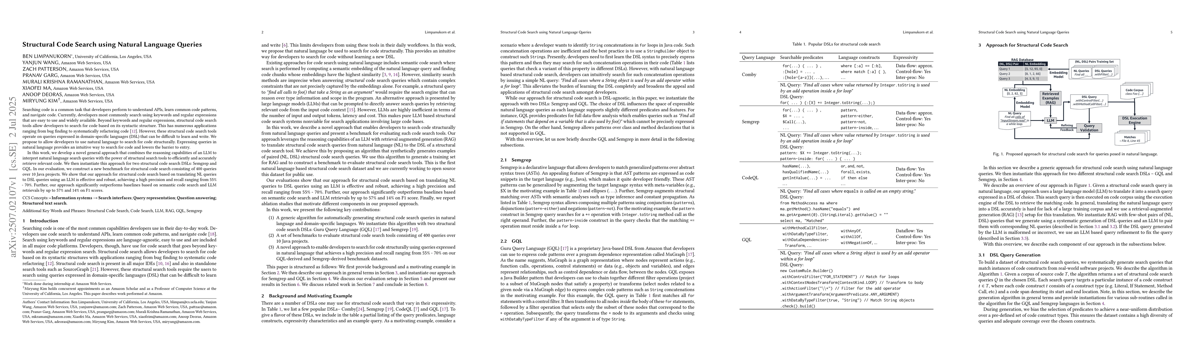 Searching code is a common task that developers perform to understand APIs, learn common code patterns, and navigate code. Currently, developers most commonly search using keywords and regular expressions that are easy to use and widely available. Beyond keywords and regular expressions, structural code search tools allow developers to search for code based on its syntactic structure. This has numerous applications ranging from bug finding to systematically refactoring code. However, these structural code search tools operate on queries expressed in domain-specific languages (DSL) that can be difficult to learn and write. We propose to allow developers to use natural language to search for code structurally. Expressing queries in natural language provides an intuitive way to search for code and lowers the barrier to entry. In this work, we develop a novel general approach that combines the reasoning capabilities of an LLM to interpret natural language search queries with the power of structural search tools to efficiently and accurately retrieve relevant code. We then instantiate this approach for two structural code search DSLs: Semgrep and GQL. In our evaluation, we construct a new benchmark for structural code search consisting of 400 queries over 10 Java projects. We show that our approach for structural code search based on translating NL queries to DSL queries using an LLM is effective and robust, achieving a high precision and recall ranging from 55% - 70%. Further, our approach significantly outperforms baselines based on semantic code search and LLM retrievals by up to 57% and 14% on F1 scores.
