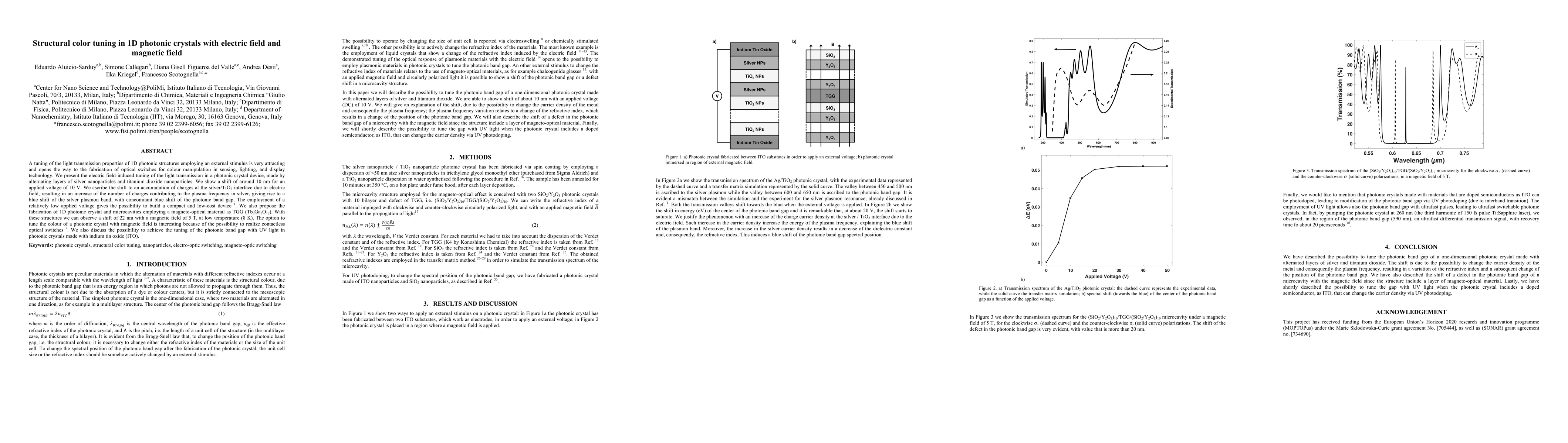 A tuning of the light transmission properties of 1D photonic structures employing an external stimulus is very attracting and opens the way to the fabrication of optical switches for colour manipulation in sensing, lighting, and display technology. We present the electric field-induced tuning of the light transmission in a photonic crystal device, made by alternating layers of silver nanoparticles and titanium dioxide nanoparticles. We show a shift of around 10 nm for an applied voltage of 10 V. We ascribe the shift to an accumulation of charges at the silver/TiO2 interface due to electric field, resulting in an increase of the number of charges contributing to the plasma frequency in silver, giving rise to a blue shift of the silver plasmon band, with concomitant blue shift of the photonic band gap. The employment of a relatively low applied voltage gives the possibility to build a compact and low-cost device. We also propose the fabrication of 1D photonic crystal and microcavities employing a magneto-optical material as TGG (Tb3Ga5O12). With these structures we can observe a shift of 22 nm with a magnetic field of 5 T, at low temperature (8 K). The option to tune the colour of a photonic crystal with magnetic field is interesting because of the possibility to realize contactless optical switches. We also discuss the possibility to achieve the tuning of the photonic band gap with UV light in photonic crystals made with indium tin oxide (ITO).