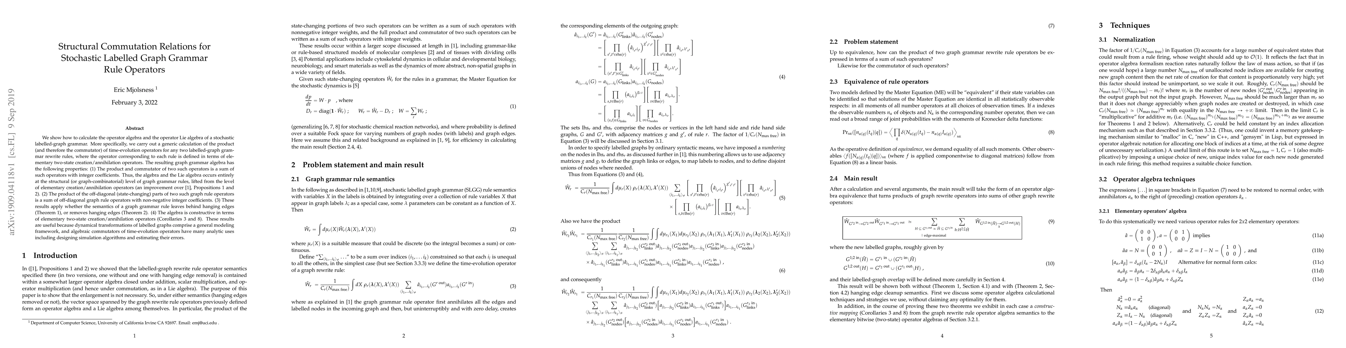 This paper develops the operator algebra and operator Lie algebra for stochastic labelled-graph grammars, focusing on the commutation relations between time-evolution operators corresponding to rewrite rules. The algebra is shown to be entirely structural, with products and commutators expressed as sums of operators with integer coefficients, applicable regardless of how edges are handled.